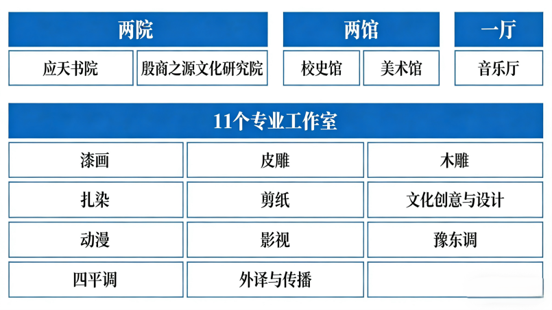 強(qiáng)化載體平臺(tái)。依托相關(guān)學(xué)院等,搭建“兩院、兩館、一廳、十一個(gè)專業(yè)工作室”(“兩院”即應(yīng)天書院、殷商之源文化研究院;“兩館”即校史館、美術(shù)館;1個(gè)音樂廳;漆畫、皮雕、木雕、扎染、剪紙、影視、動(dòng)漫、文化創(chuàng)意與設(shè)計(jì)、豫東調(diào)、四平調(diào)、外譯與傳播等11個(gè)專業(yè)工作室),著力打造綜合性、開放性文化育人實(shí)踐實(shí)訓(xùn)平臺(tái)。