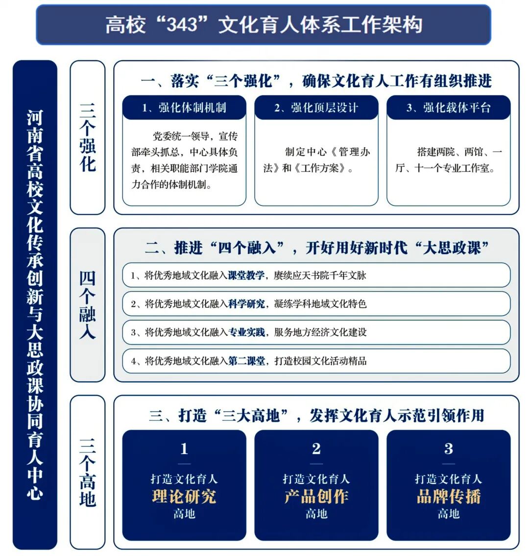 強(qiáng)化體制機(jī)制。依托河南省高校文化傳承創(chuàng)新與大思政課協(xié)同育人中心,構(gòu)建黨委統(tǒng)一領(lǐng)導(dǎo),宣傳部牽頭抓總,“中心”具體負(fù)責(zé),教務(wù)處、科研處、學(xué)工部、團(tuán)委等單位和學(xué)院通力合作的文化育人體制機(jī)制。