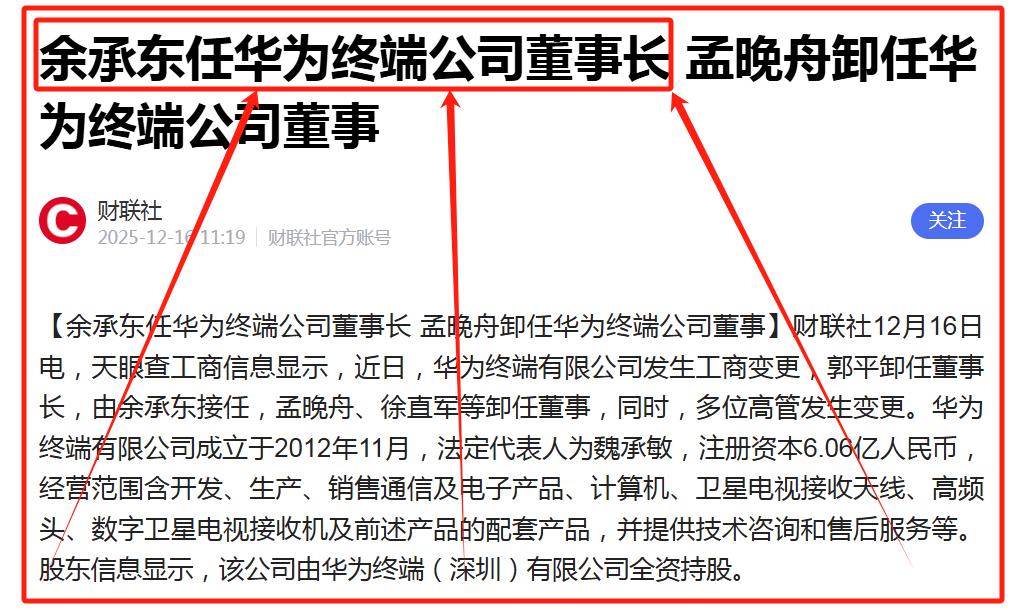 天眼查上的一則工商變更信息,像一塊投入湖面的石頭,激起層層漣漪:余承東接任華為終端有限公司董事長,孟晚舟等人卸任董事。