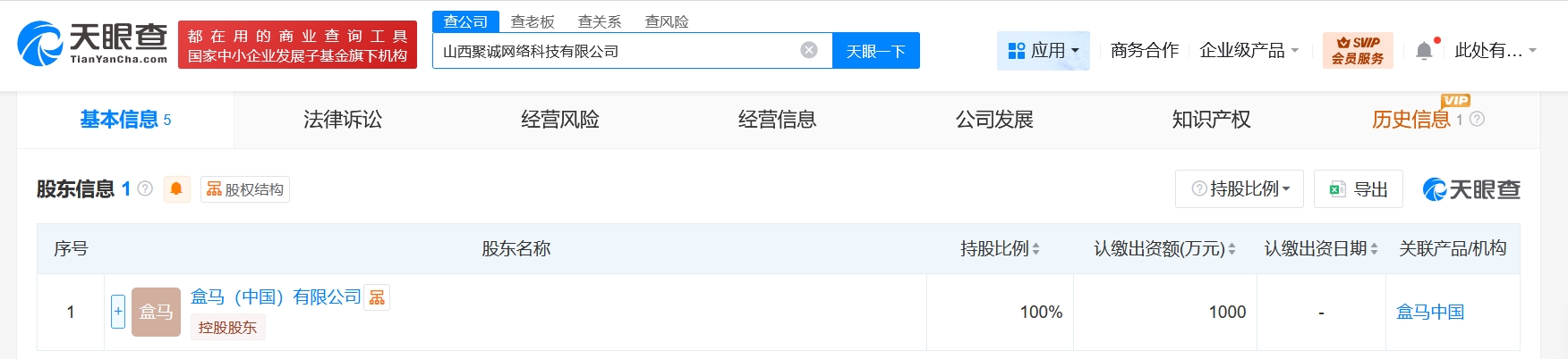 雷達財經訊,天眼查App顯示,近日,山西聚誠網絡科技有限公司成立,法定代表人為高強,注冊資本1000萬人民幣,經營范圍含餐飲服務、食品銷售、日用家電零售、健康咨詢服務、會議及展覽服務、單用途商業預付卡代理銷售、停車場服務、日用百貨銷售等,由盒馬(中國)有限公司全資持股。