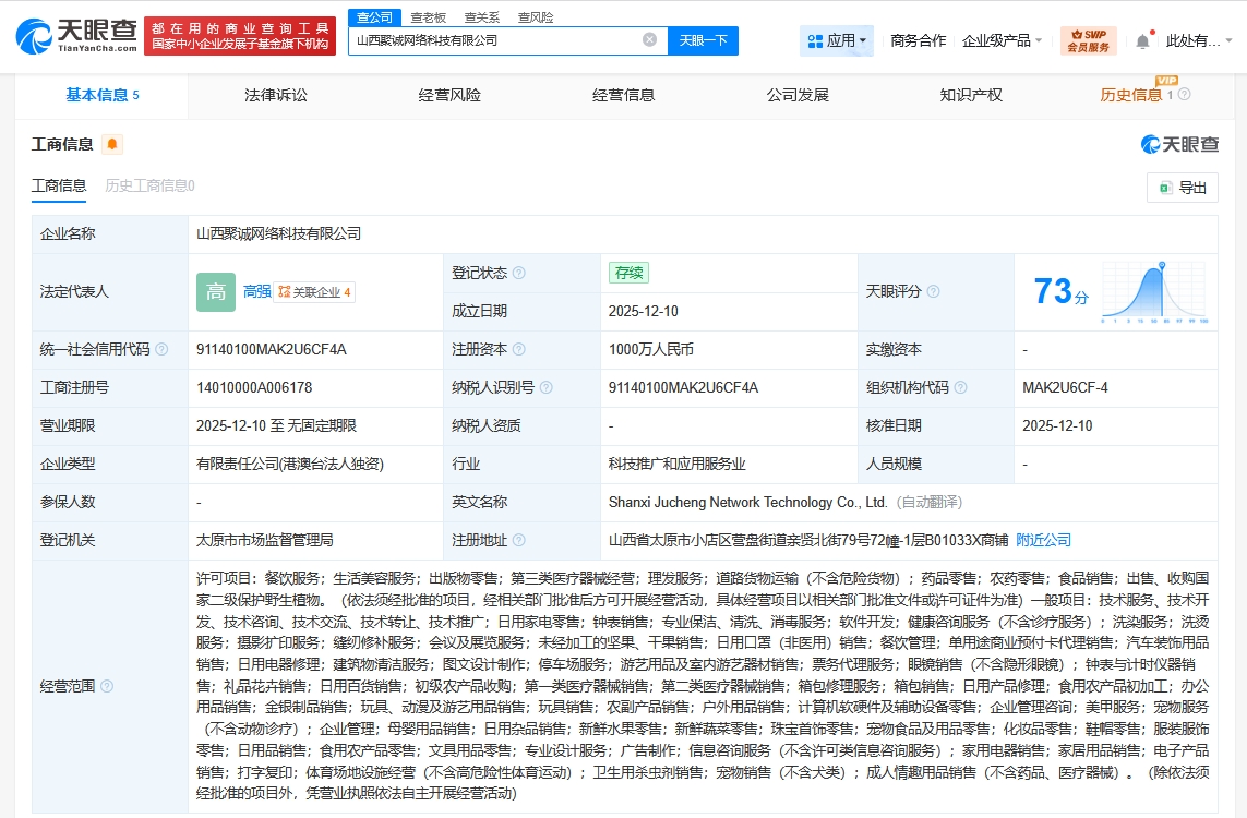 天眼查App顯示,近日,山西聚誠網絡科技有限公司成立,法定代表人為高強,注冊資本1000萬人民幣,經營范圍含餐飲服務、食品銷售、日用家電零售、健康咨詢服務、會議及展覽服務、單用途商業預付卡代理銷售、停車場服務、日用百貨銷售等,由盒馬(中國)…