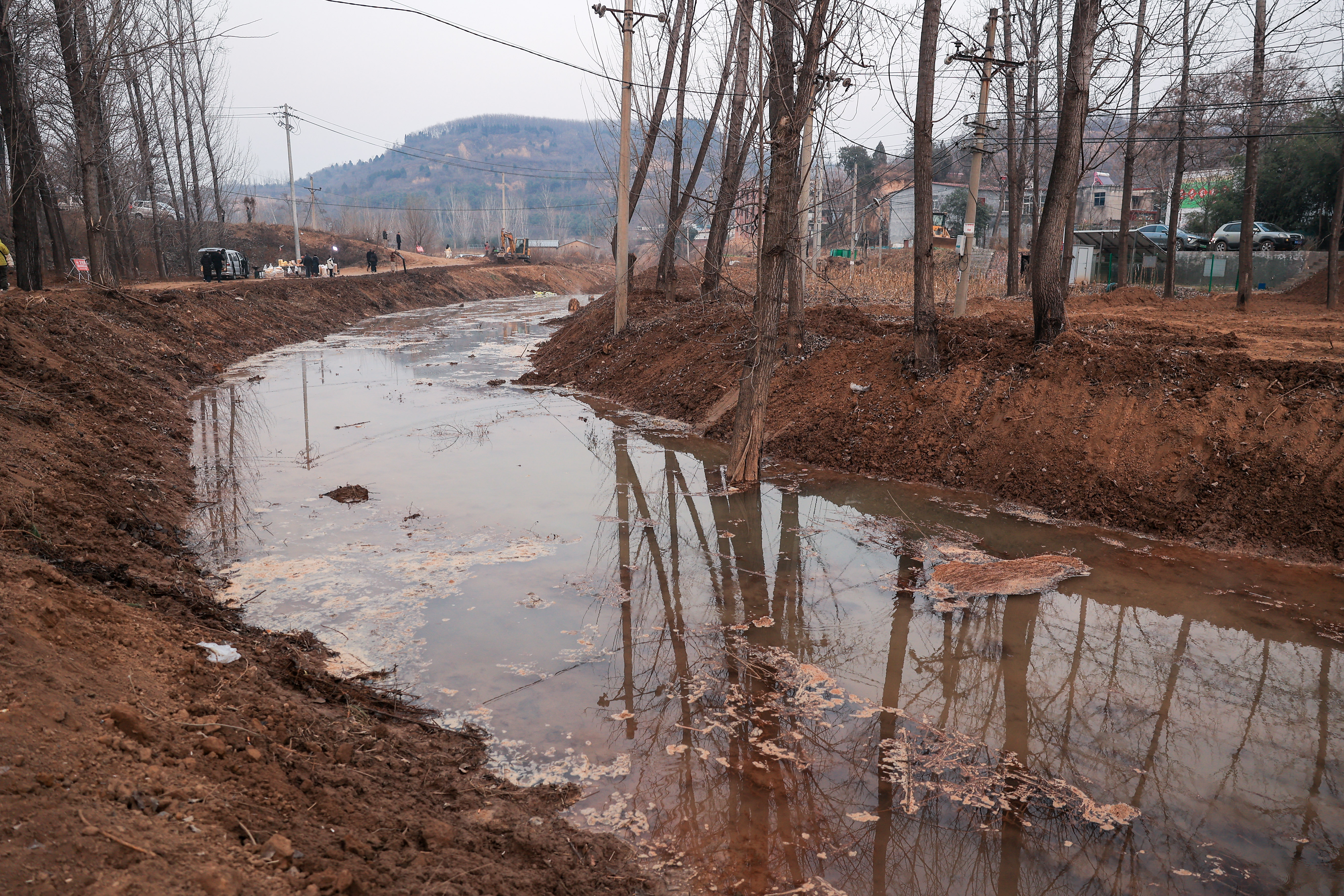 12月16日,時隔近十天,頂端新聞記者再次探訪賈魯河源頭復涌現場。原本蜿蜒的溪流,如今已拓展為約十米寬的河道。出水口水流依然湍急,持續不斷地自南向北匯入尖崗水庫。現場,閆家咀社區的社區工作者和志愿者正在維持秩序。