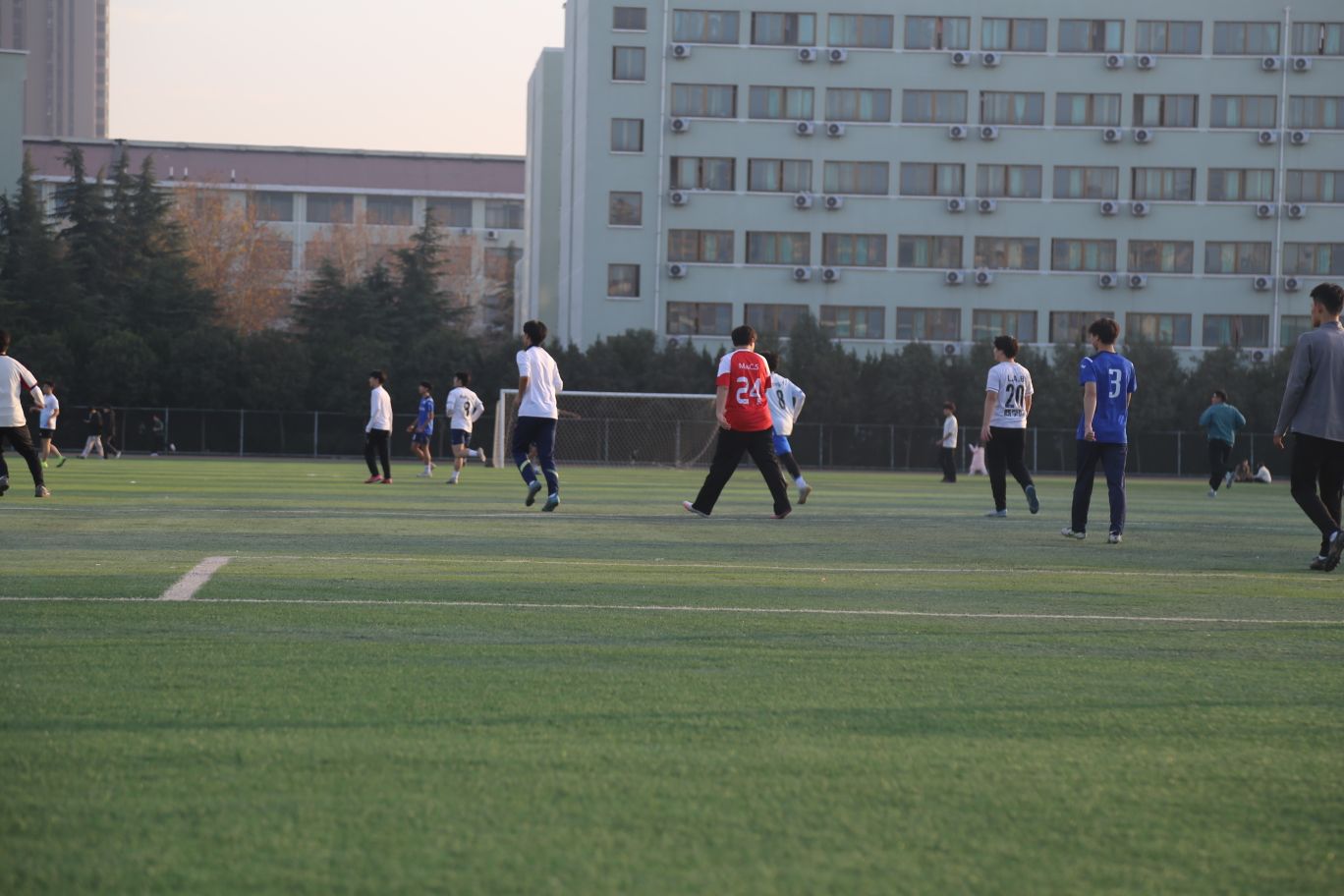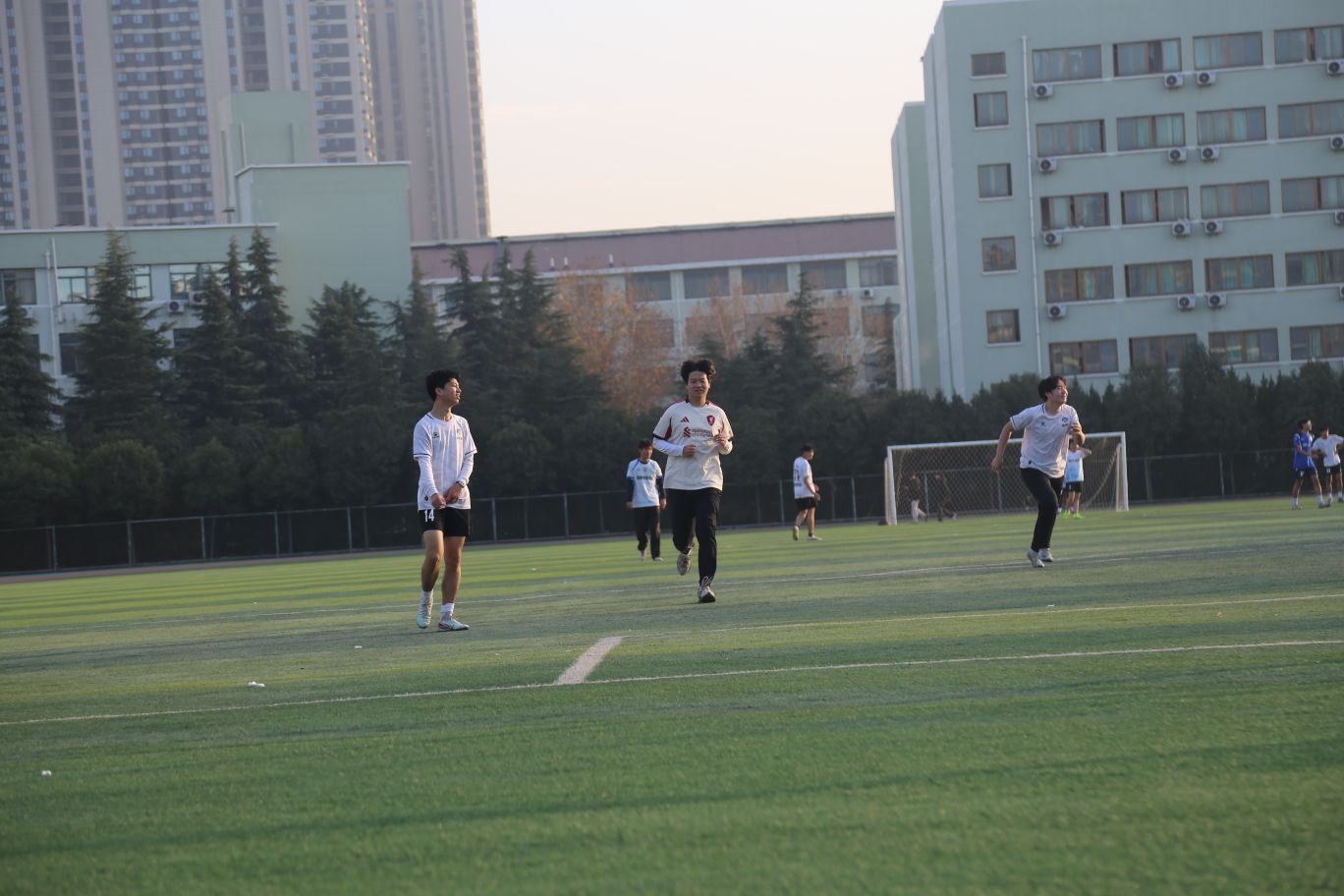 午后的陽光正好,把經貿的運動場地揉進了暖洋洋的光暈里。大操場的草坪被曬得軟軟的,足球場上同學們踩著光影奔跑起來,大喊著傳球的熱鬧,讓整片草坪都跟著沸騰。陽光在他們的球衣上跳蕩,每一次沖刺、每一回傳球,都裹著少年人擋不住的朝氣。