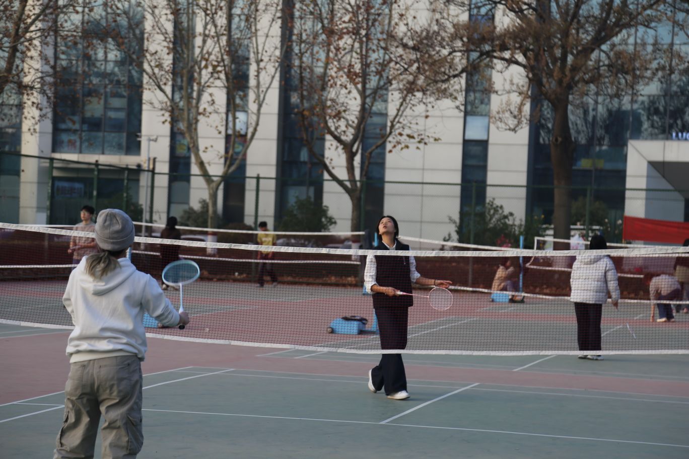 小操場這邊也絲毫不冷清,羽毛球網前正打得火熱。你來我往的對打里,滿是酣暢的快樂;紅藍色的乒乓球臺靜靜立著,午后的陽光落在臺面上,仿佛在等著有人拿起球拍,來一場速戰速決的比拼。