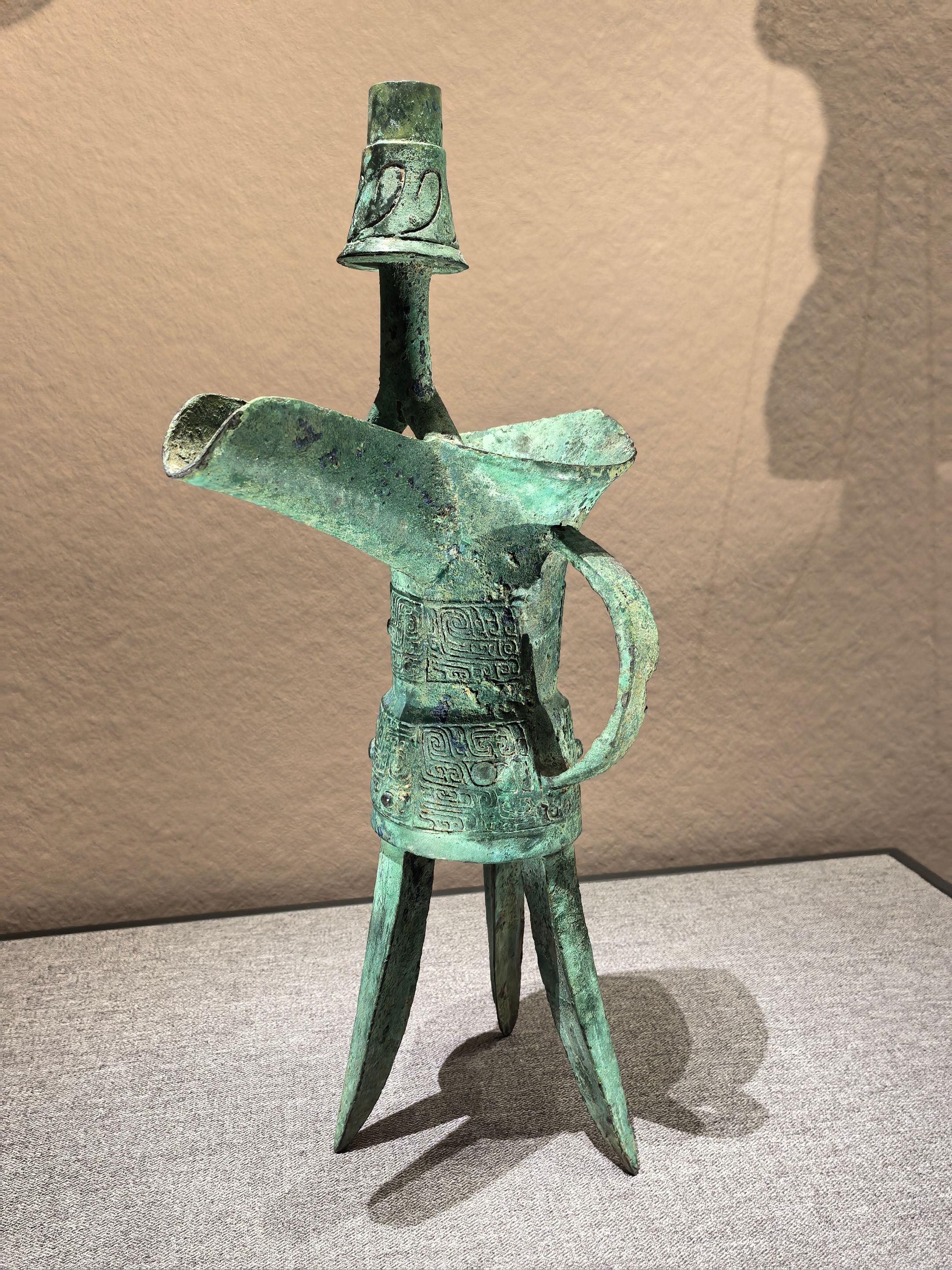 爵是商周時期最具代表性的飲酒器之一,常與觥、尊、罍等配合使用。安博這件青銅爵與常見的雙柱爵不同,此器僅設單柱,這在考古發現中較為罕見。柱頂呈菌狀,飾有弦紋,既具裝飾性,也可能在使用時起到固定濾網或象征身份的作用。三足外撇,既保證了穩定性,又賦予器物向上的動感。