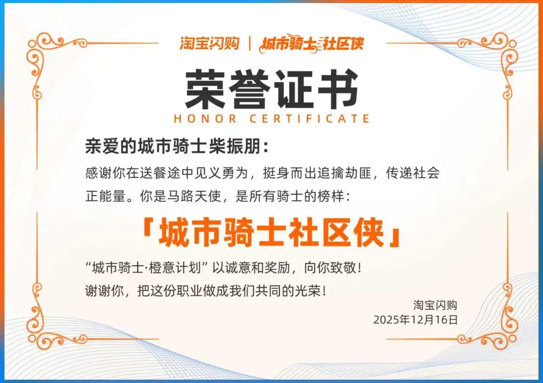 記者了解到,為表彰柴振朋見義勇為的行為,淘寶閃購對柴振朋給予“城市騎士·橙意計劃”獎勵,授予他“ 城市騎士社區俠”榮譽稱號,以及1萬元現金獎勵。