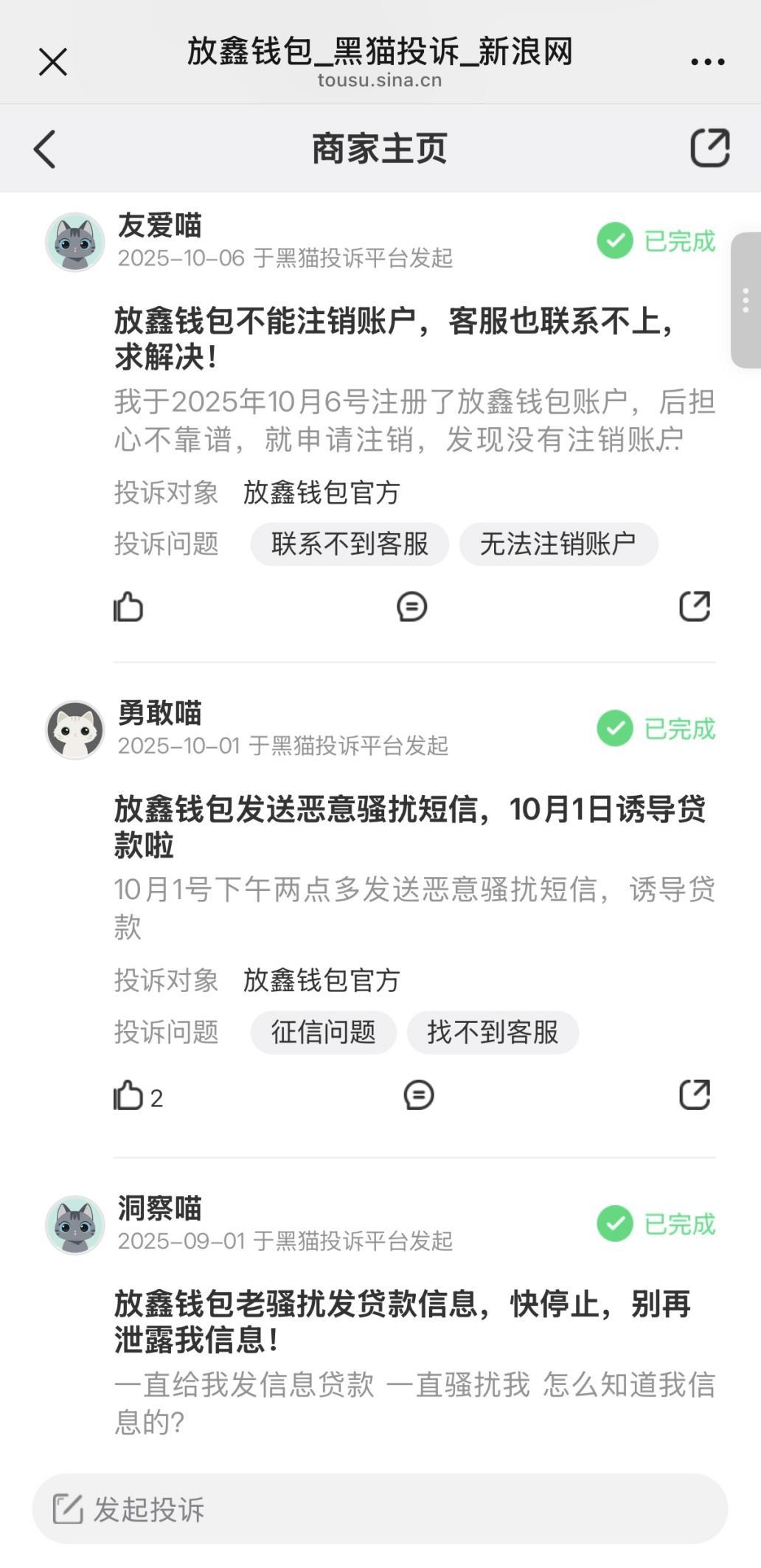 在黑貓投訴平臺,有關放鑫錢包的爭議也多圍繞“盜用身份證信息”、“電話短信轟炸”、“無本人授權下申請貸款并授信”等情形,投訴信息中也提及“無法注銷賬戶”、“無法聯系客服”等情況,暴露出第三方運營中不專業、不穩定的問題。