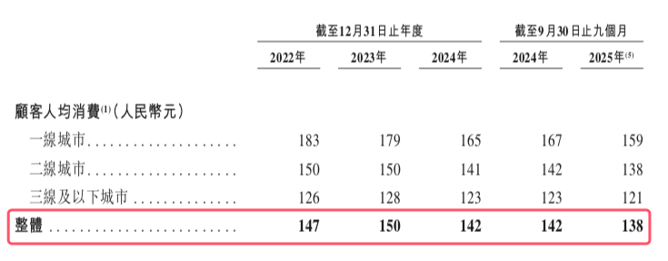 截至2025年9月30日,一線城市門店的門店經營利潤率為21.3%,二線及以下城市門店經營利潤率為25.2%,整體人均消費由去年同期的142元下滑至138元,翻臺率由3.1提升至3.6次/天。