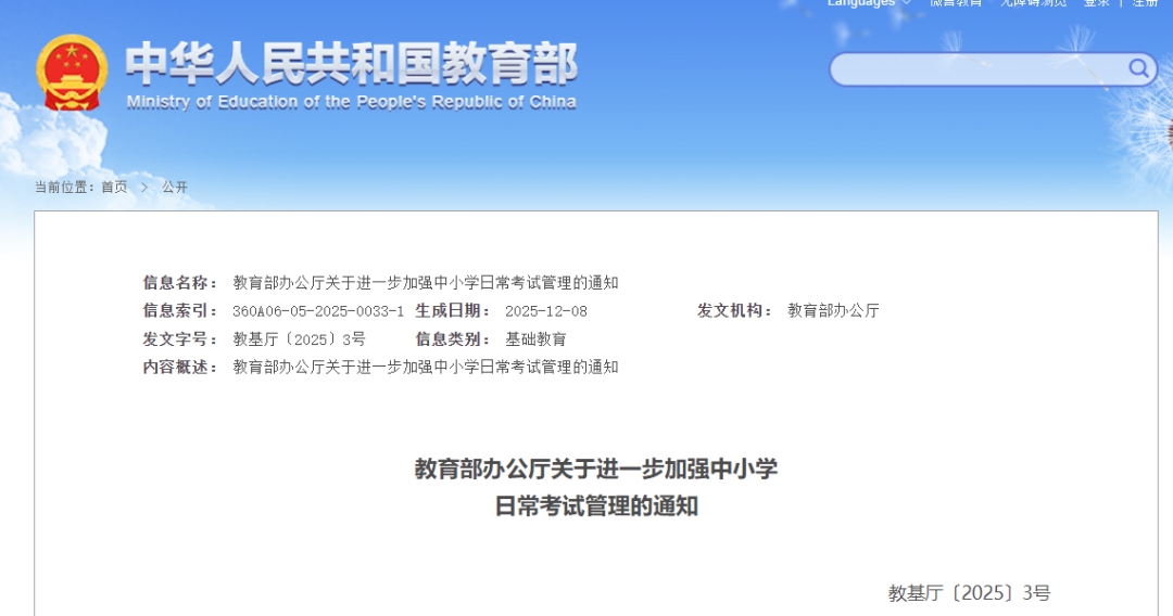 教育部辦公廳關于進一步加強中小學日常考試管理的通知
