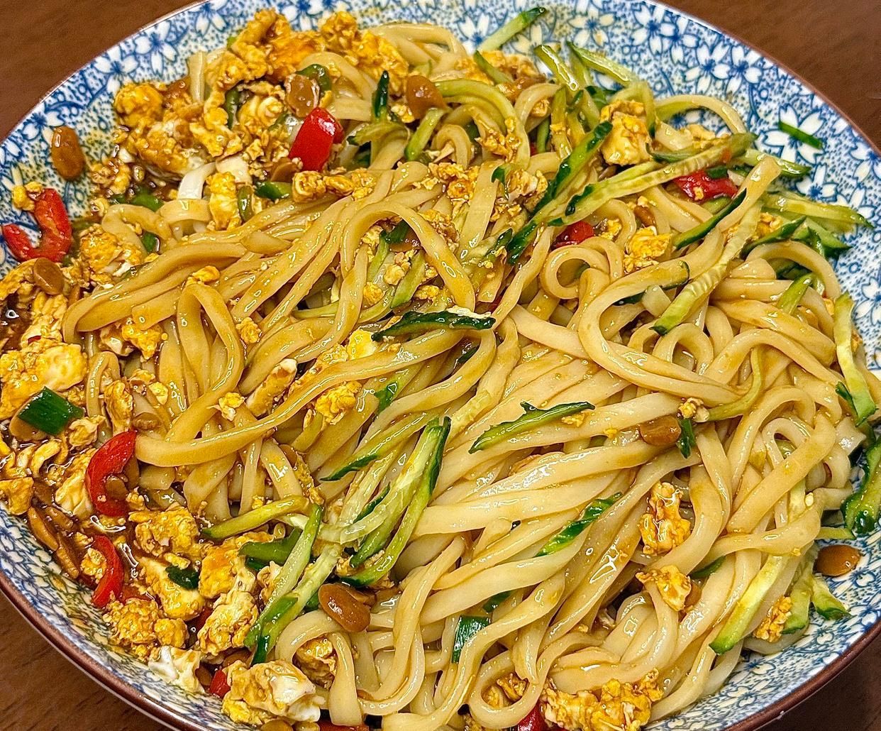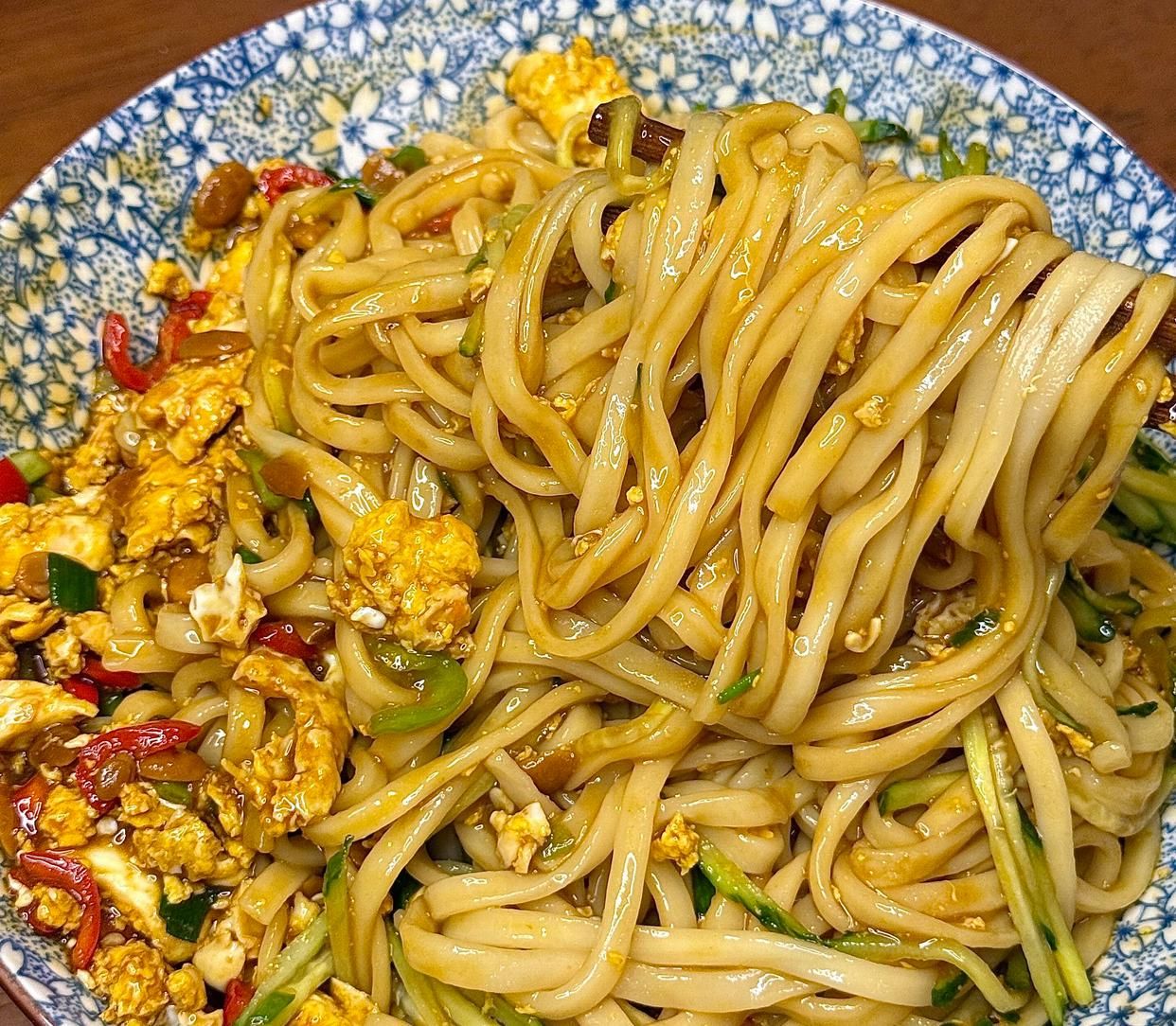這樣,香噴噴的雞蛋醬就做好了,把雞蛋醬均勻地澆在煮好的面條上,再放上切好的黃瓜絲,用筷子把面條、雞蛋醬和黃瓜絲充分拌勻,讓每一根面條都裹上濃郁的醬汁。
