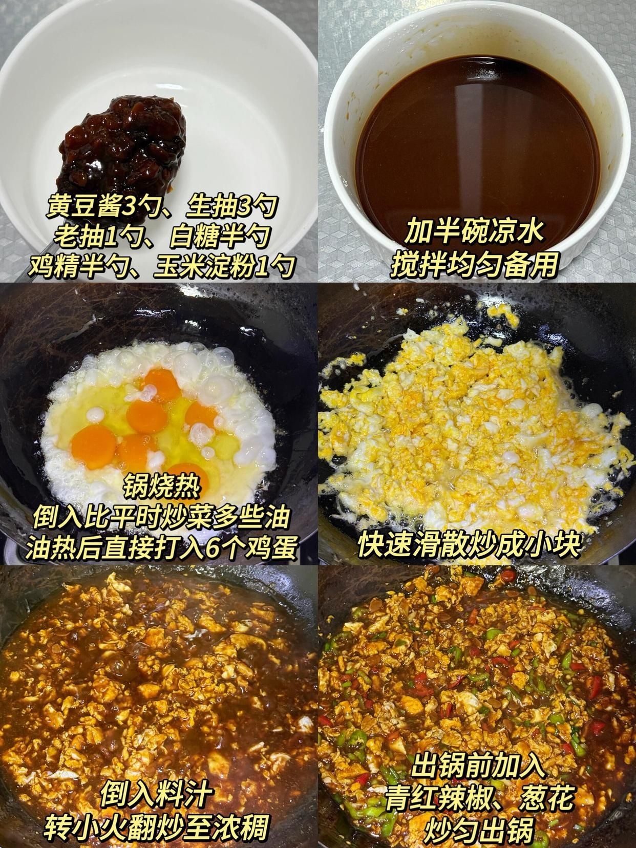 雞蛋炒到表面金黃,完全熟透后,就把調好的料汁倒進去。料汁是提前用黃豆醬 3 勺、生抽 3 勺、老抽 1 勺、白糖半勺、雞精少量、玉米淀粉 1 勺,再加入大半碗涼水攪拌均勻制成的,攪拌的時候要多攪幾下,確保玉米淀粉完全融化,沒有顆粒,不然煮的時候容易結塊。