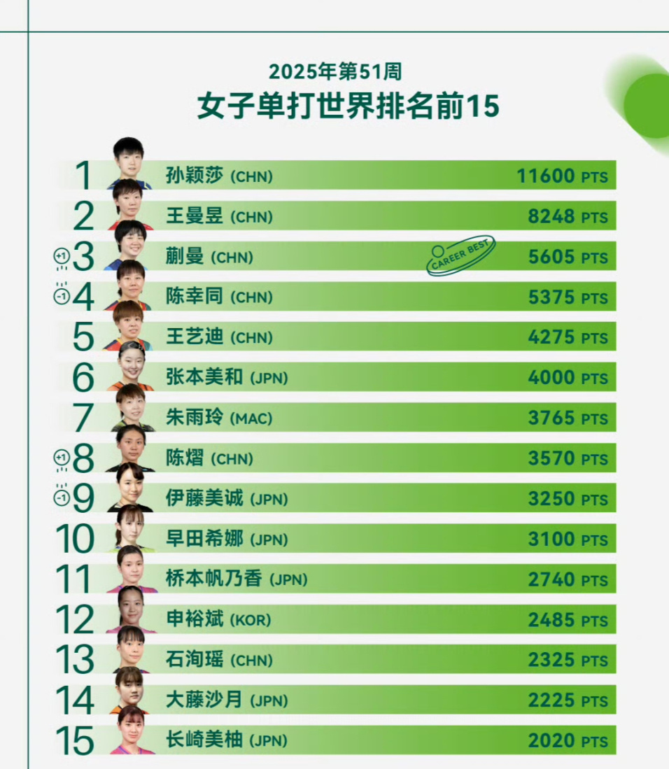 國際乒聯2025年第51周世界排名,剛剛結束的WTT香港總決賽為時間節點。以近期,乒乓球賽事密集,前有混合團體世界杯,后者香港總決賽。稍早前的2025混合團體世界杯,“小魔王”孫穎莎、“鰻魚”王曼昱攜手王藝迪等隊友,在決賽中以8-1 戰勝日本隊奪得冠軍。