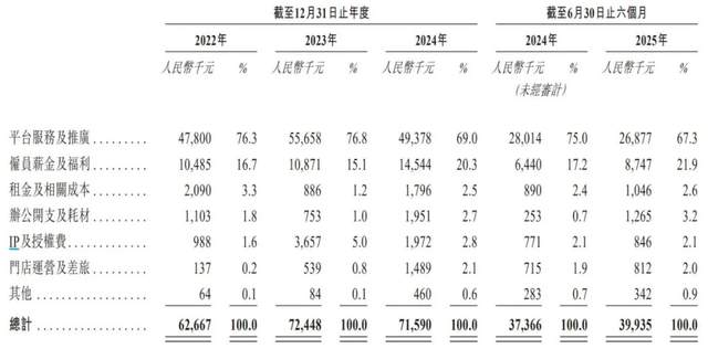 基于此,銅師傅2022年—2024年及2025年上半年的銷售及營銷開支分別為6266.7萬元、7244.8萬元、7159萬元和3993.5萬元,分別占各期收入的12.4%、14.3%、12.5%和13%。而銷售及營銷開支中主要是平臺服務及推廣費用,各期分別為4780萬元、5565.8萬元、4937.8萬元和2687.7萬元,分別占比76.3%、76.8%、69%和67.3%。