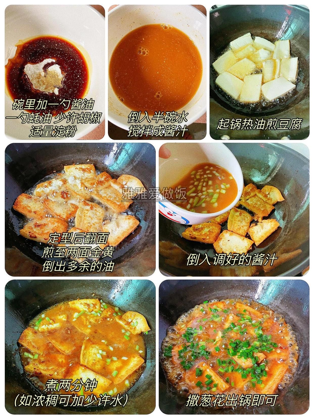 北豆腐1塊 香蔥2根 生抽1勺 蠔油1勺 白胡椒粉半勺 玉米淀粉1勺 清水半碗 食用油適量