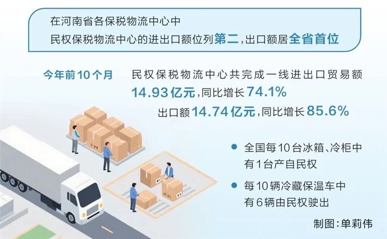 統計數據顯示,今年前10個月,民權保稅物流中心共完成一線進出口貿易額14.93億元,同比增長74.1%。其中,出口數據尤為突出,出口額14.74億元,同比增長85.6%。