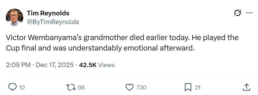 只不過,文班亞馬的低迷情有可原,根據馬刺跟隊記者Tim Reynolds報道,文班亞馬的祖母在今天早些時候去世,文班堅持完賽,賽后采訪難掩情緒傷心落淚。