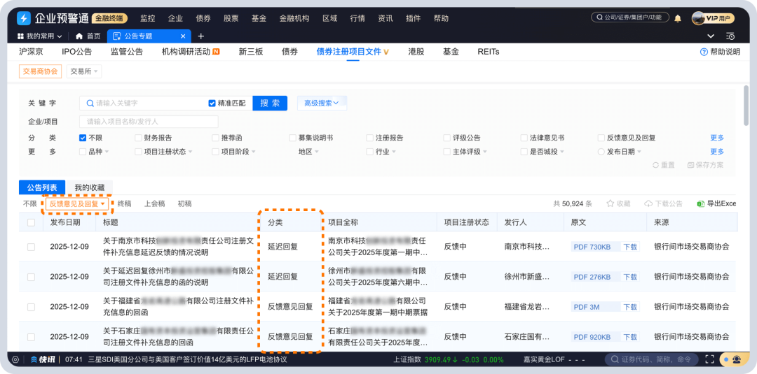 債券注冊項目文件:新增“反饋意見”、“反饋意見回復”、“延遲回復” 等細分篩選。