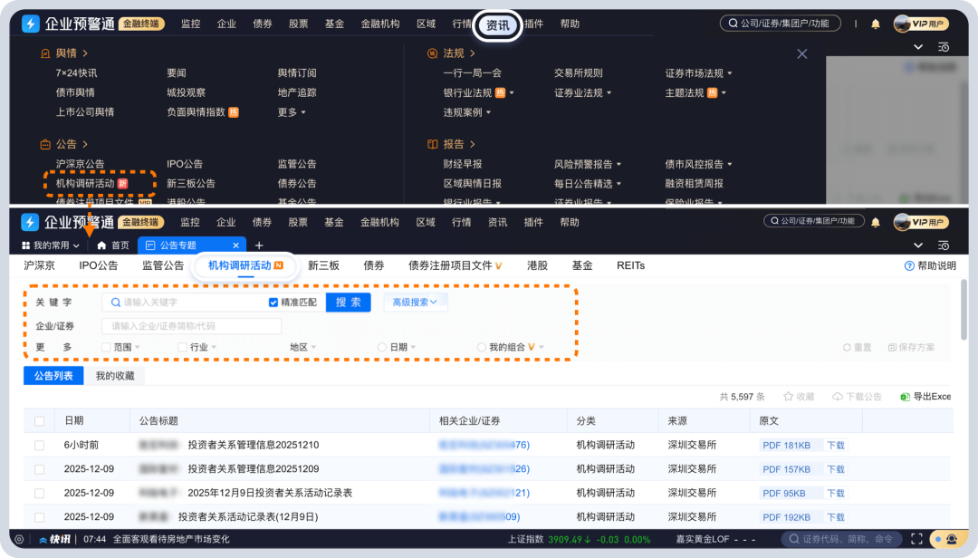 公告專題新增【機構調研活動】專欄!企業預警通優化專題,覆蓋覆蓋上交所、深交所、北交所等來源的投資者關系活動記錄等調研紀要文件。