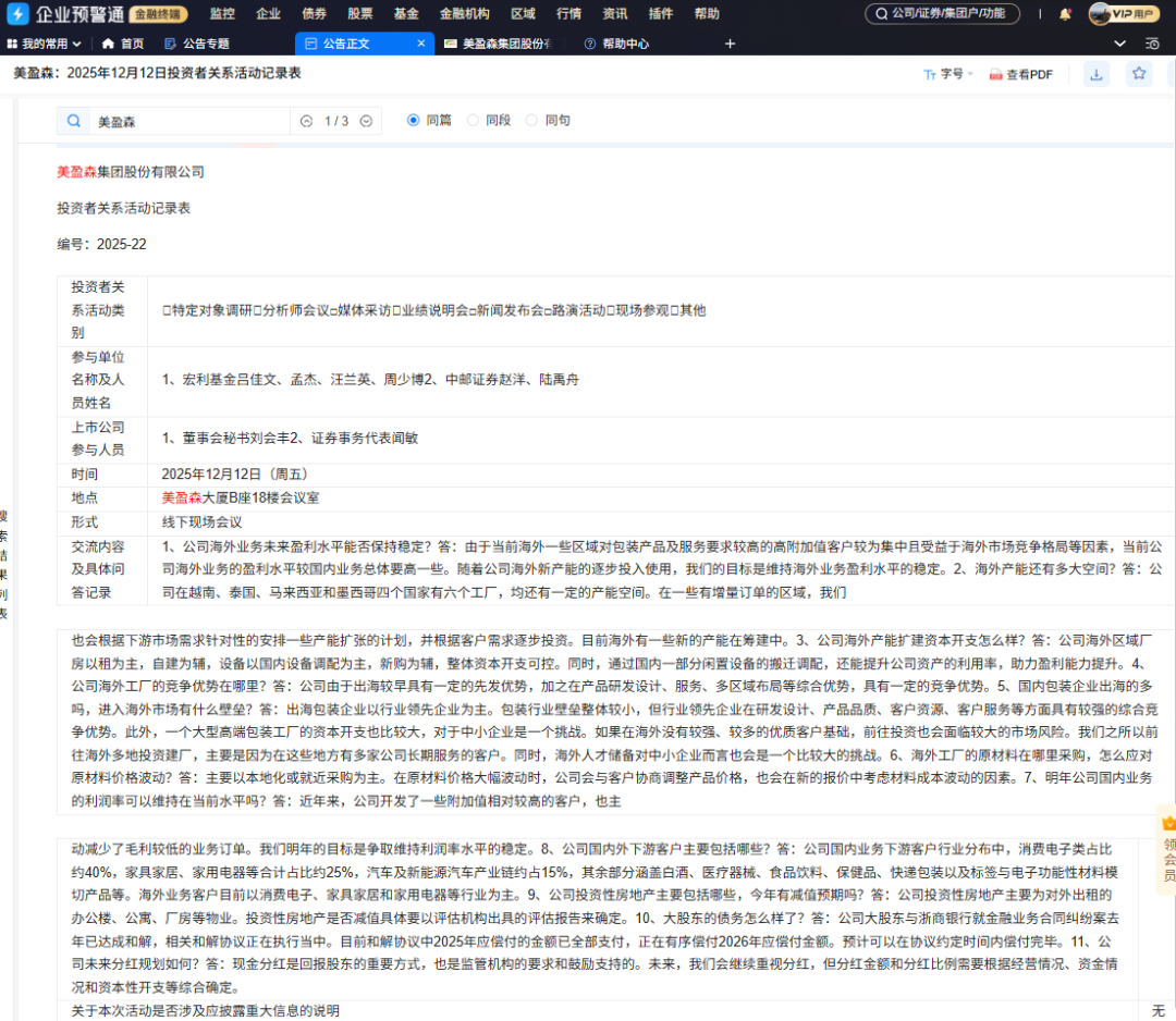 以12月12日美盈森的調研活動公告為例。公告內容包括時間、地點、參會人等重要信息,還有交流內容及具體問答記錄,一共3頁內容。