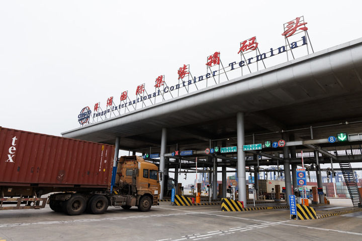 在位于儋州市的洋浦國際集裝箱碼頭,貨車在進行“二線口岸”壓力測試演練(2025年12月11日攝)。新華社記者 金立旺 攝
