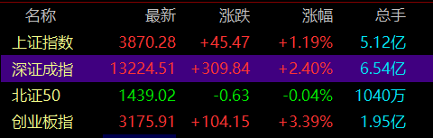 【大河財立方消息】12月17日,A股三大指數集體收漲,截至收盤,上證指數漲1.19%,深證成指漲2.40%,創業板指漲3.39%。全市場超3600只個股上漲,逾1600只個股下跌。