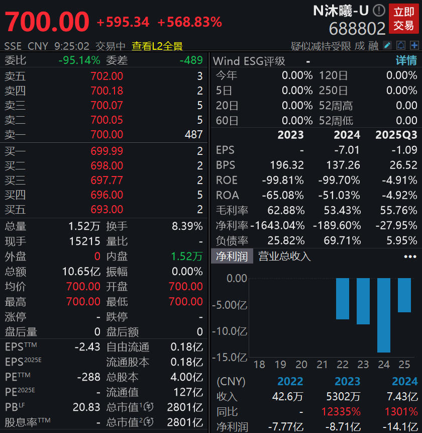 沐曦股份今日登錄科創板,開盤大漲568.83%報700.00元,總市值2801億元。