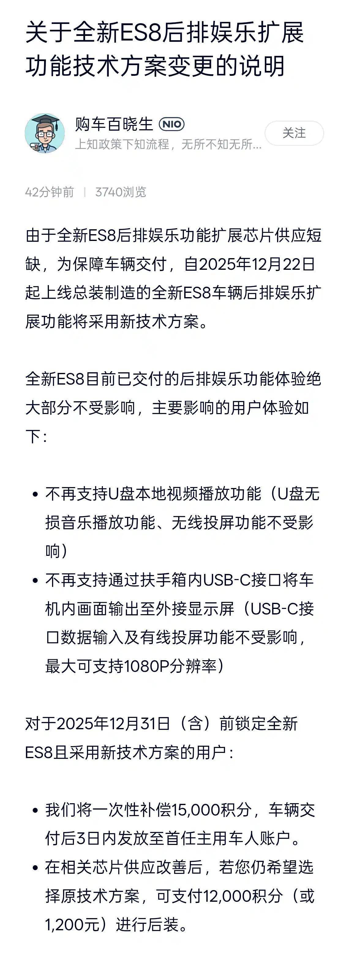與此同時(shí),對(duì)于 2025年12月31日(含)前鎖定全新 ES8 且采用新技術(shù)方案的用戶:將一次性補(bǔ)償15000積分,車(chē)輛交付后 3 日內(nèi)發(fā)放至首任主用車(chē)人賬戶;在相關(guān)芯片供應(yīng)改善后,若客戶仍希望選擇原技術(shù)方案,可支付12,000積分(或 1,200元)進(jìn)行后裝。