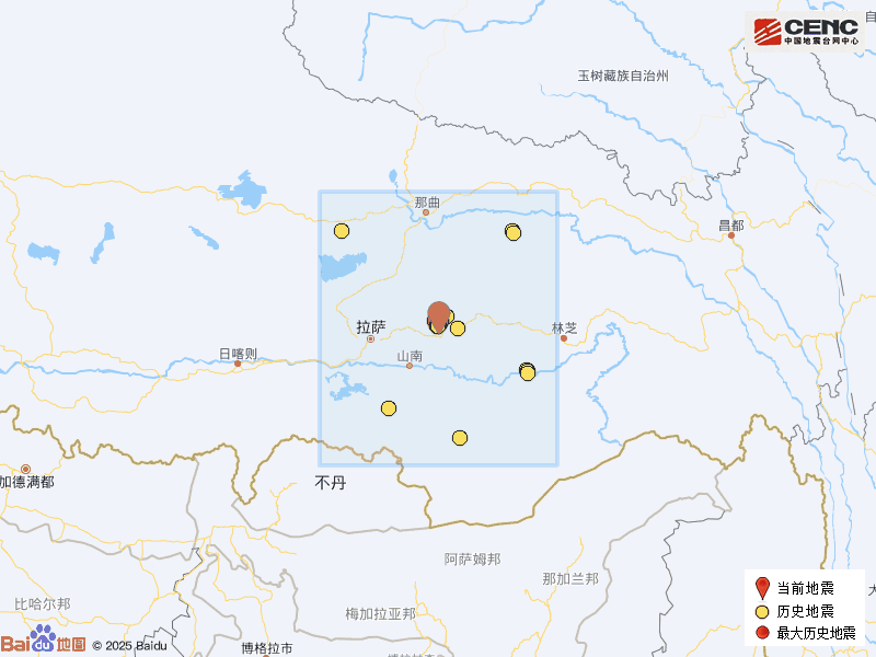 歷史地震:根據中國地震臺網速報目錄,震中周邊200公里內近5年來發(fā)生3級以上地震共32次,最大地震是2024年11月7日在西藏拉薩市墨竹工卡縣發(fā)生的4.5級地震(距離本次震中5公里),歷史地震分布如圖。
