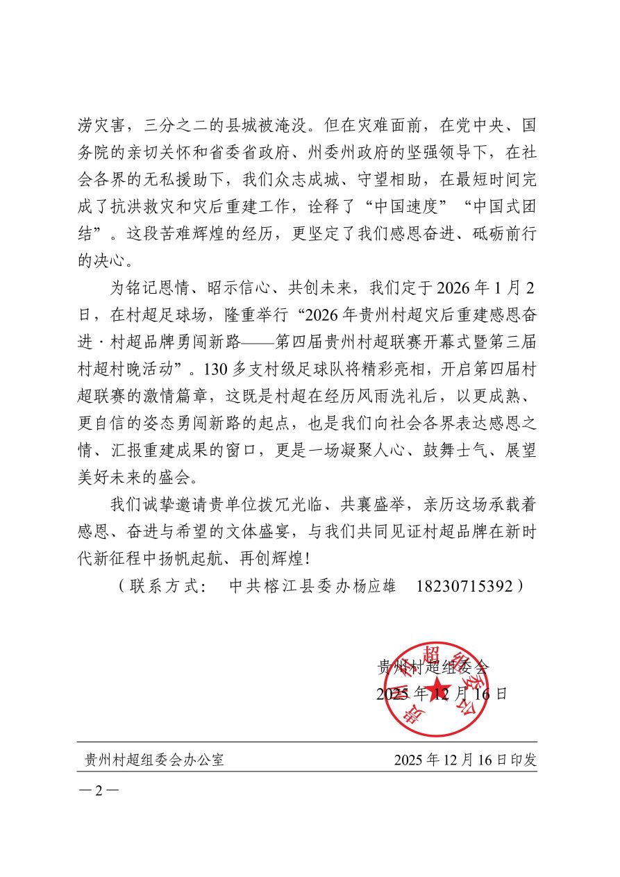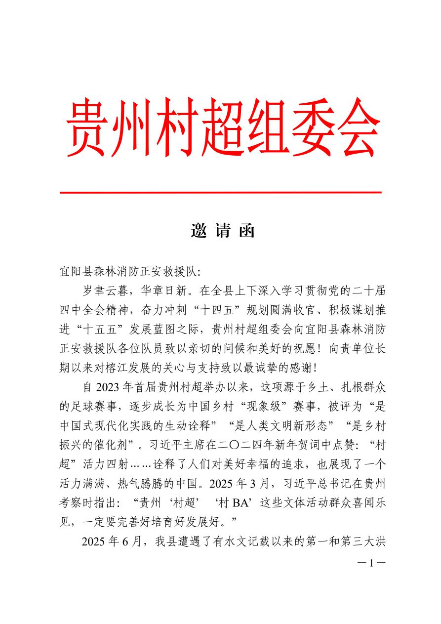 貴州村超組委會向宜陽縣森林消防安正救援隊致以誠摯問候,并對救援隊長期以來在應急搶險、守護群眾生命財產安全方面的無私奉獻表示衷心感謝。邀請函回顧了“貴州村超”自2023年創辦以來,作為扎根鄉土、源于民間的體育盛事,已成長為推動鄉村振興的重要力量,被贊譽為“中國式現代化實踐的生動詮釋”。特別提到2025年6月,榕江縣遭遇有水文記錄以來最嚴重的洪澇災害,面對汛情險情,全國各地多支救援力量挺身而出,其中宜陽縣森林消防安正救援隊的專業表現和英勇擔當,贏得了當地群眾的高度認可與廣泛贊譽。