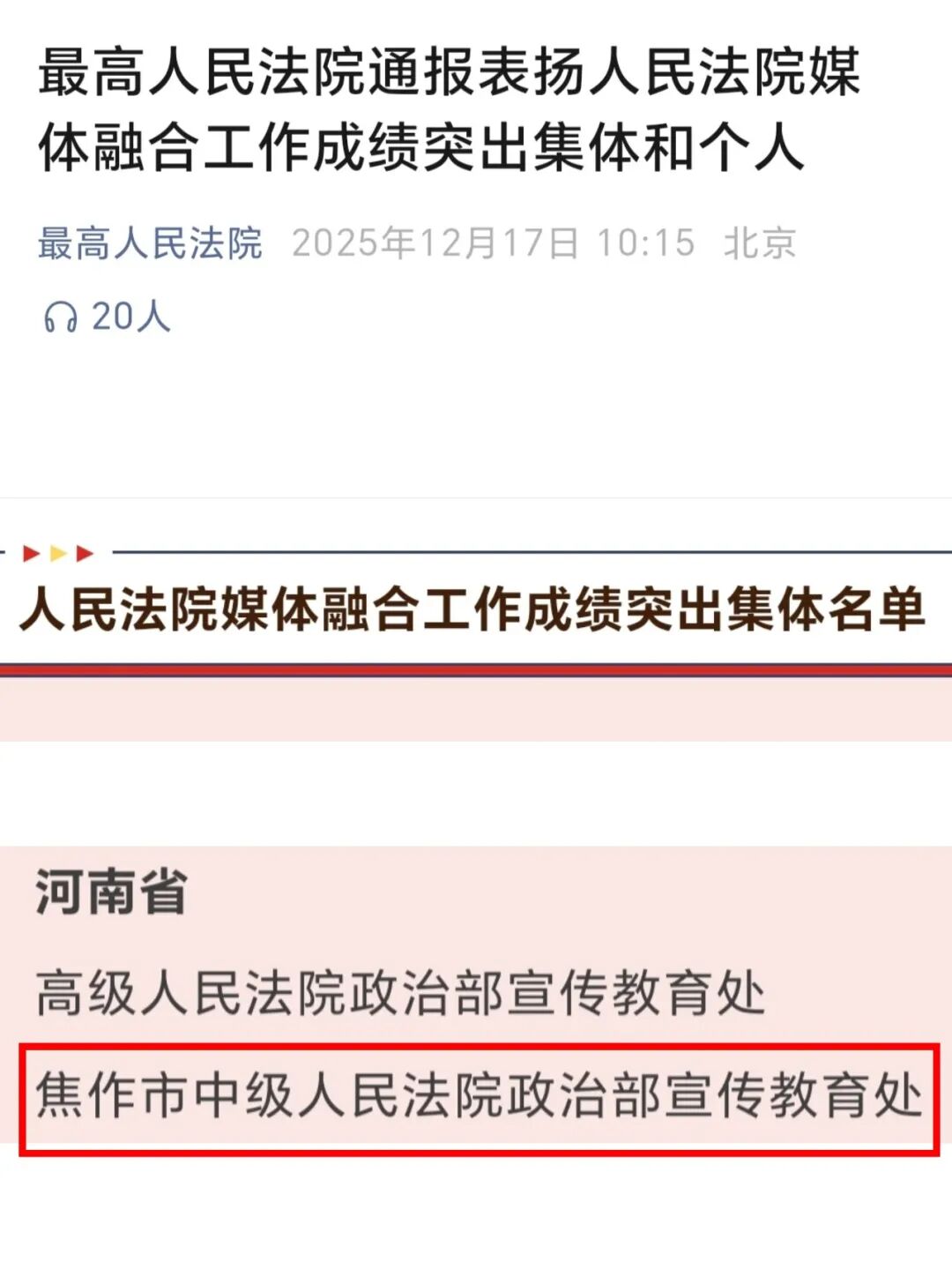 為肯定成績、凝聚力量,推動新時代人民法院媒體融合工作高質量發展,12月17日,最高人民法院公布人民法院媒體融合工作成績突出集體和個人,焦作中院榜上有名!