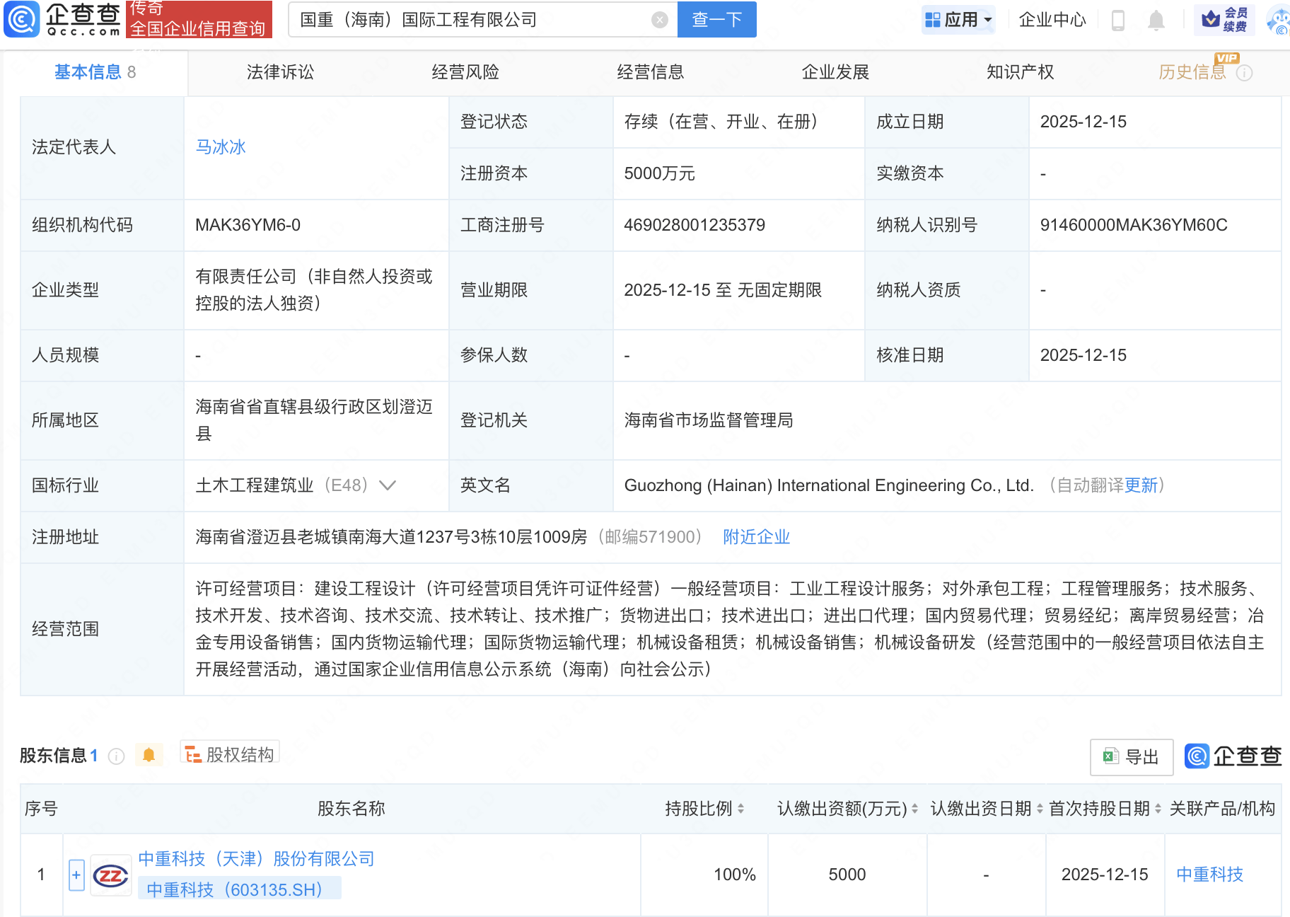 企查查APP顯示,近日,國重(海南)國際工程有限公司成立,注冊資本5000萬元,經營范圍包含:國內貿易代理;貿易經紀;離岸貿易經營;冶金專用設備銷售等。企查查股權穿透顯示,該公司由中重科技(603135)全資持股。