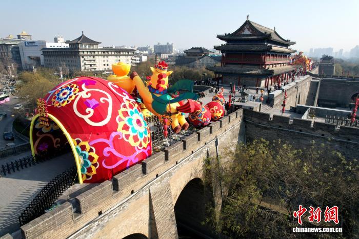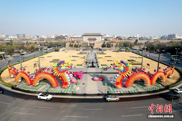 圖為南門南廣場上的巨龍燈組。(無人機(jī)照片)中新社記者 張遠(yuǎn) 攝