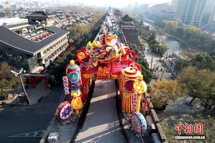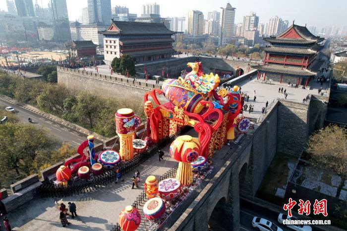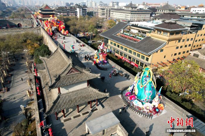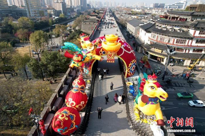 圖為南門城墻上的燈組。(無人機(jī)照片)中新社記者 張遠(yuǎn) 攝