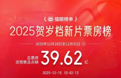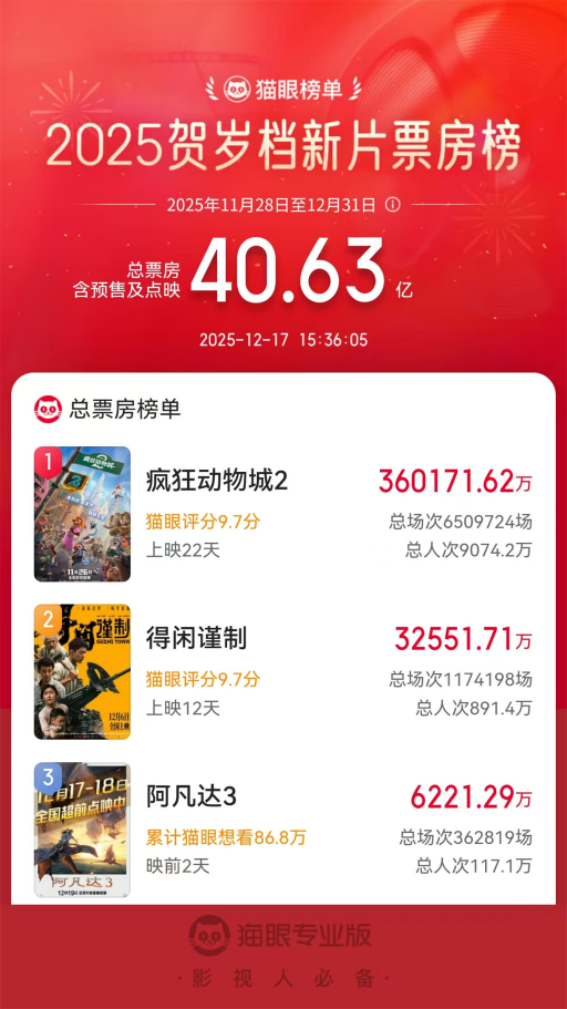 截至12月17日,2025年賀歲檔新片總票房(含預(yù)售)已突破40億元,較去年同期大幅增長超20億元,市場熱度顯著攀升。迪士尼現(xiàn)象級動畫《瘋狂動物城2》以超過36億元的票房成績持續(xù)領(lǐng)跑;正午陽光首部院線電影《得閑謹制》票房突破3億元,暫列檔期票房榜第二位。