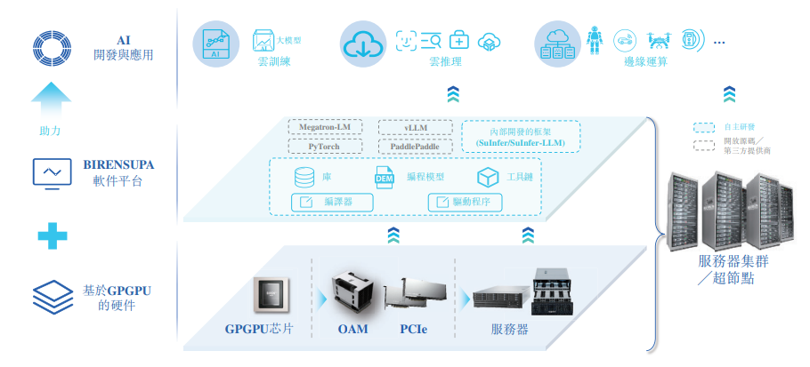 通過整合自主研發的基于GPGPU的硬件及專有的BIRENSUPA軟件平臺,公司的解決方案支持從云端到邊緣的廣泛的AI模型訓練與推理應用。