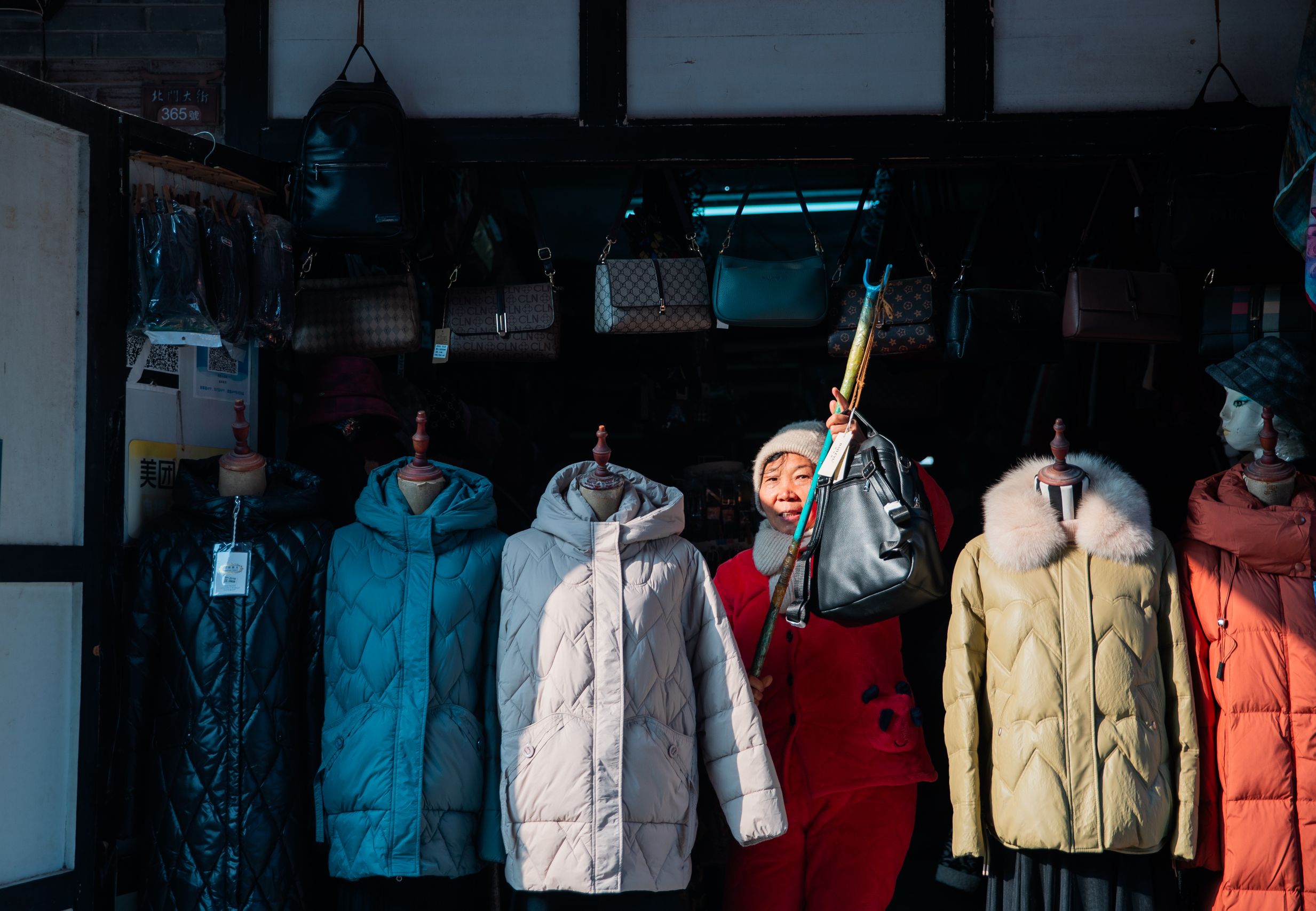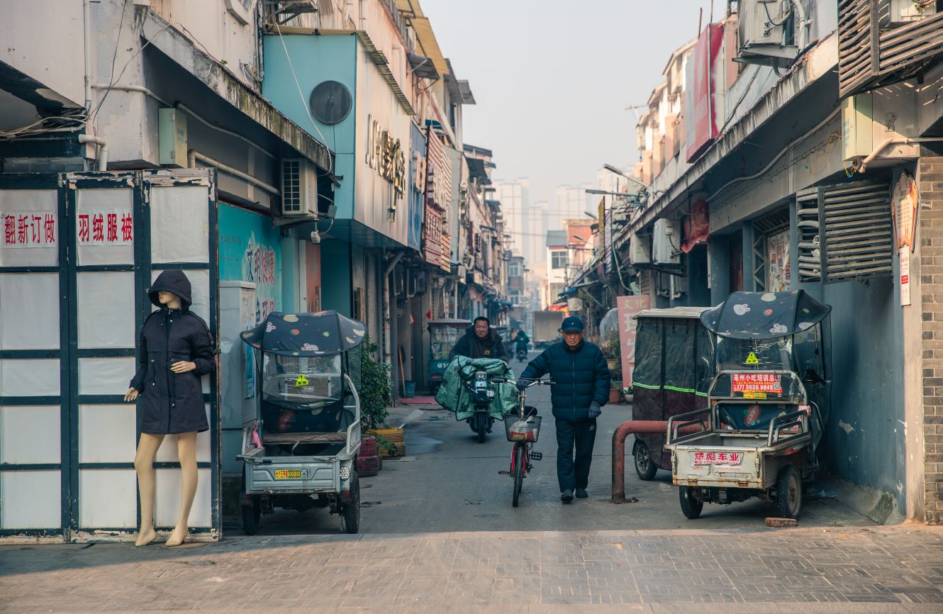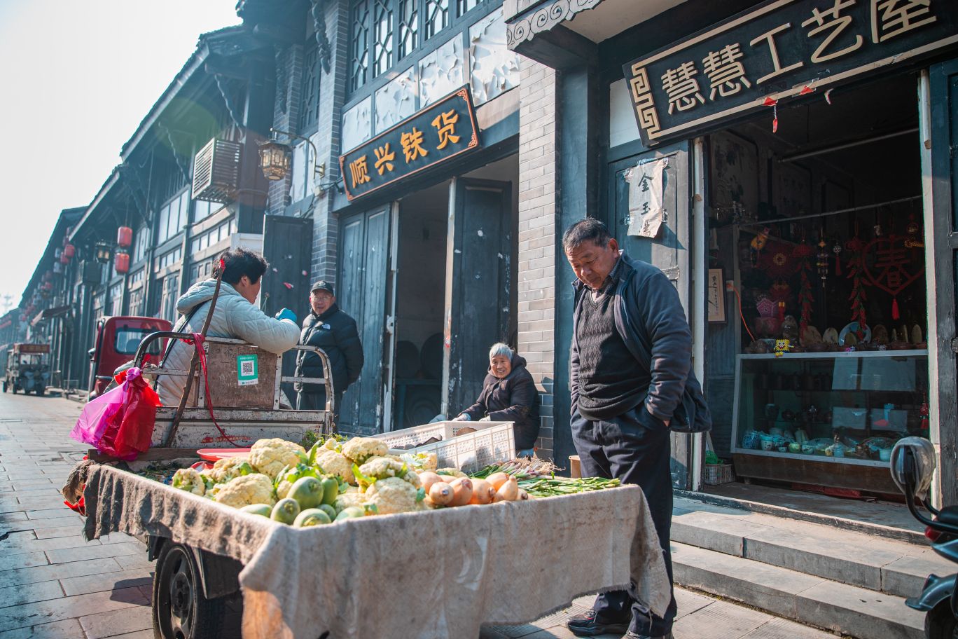 晾衣桿斜在店鋪外,簸箕里的年貨浸著光,連腳手架的陰影里,都站著慢悠悠聊天的人。雜貨鋪的棉襖擠著皮包,裁縫鋪的棉絮飄在舊布簾旁,連墻角的石膏像,都沾著煙火氣的暖。