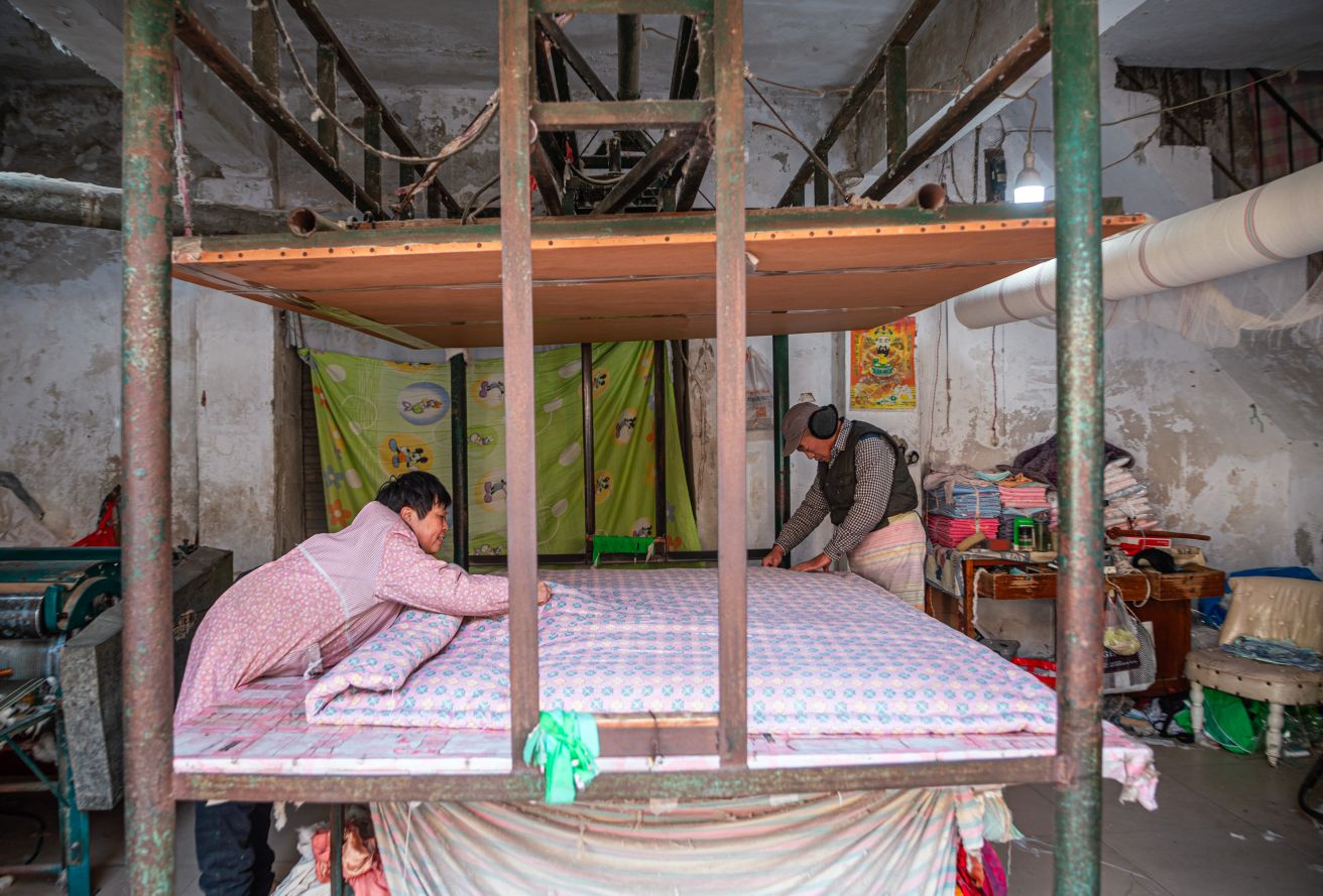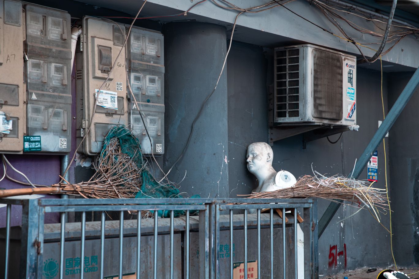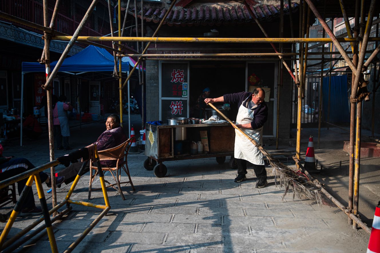 晾衣桿斜在店鋪外,簸箕里的年貨浸著光,連腳手架的陰影里,都站著慢悠悠聊天的人。雜貨鋪的棉襖擠著皮包,裁縫鋪的棉絮飄在舊布簾旁,連墻角的石膏像,都沾著煙火氣的暖。