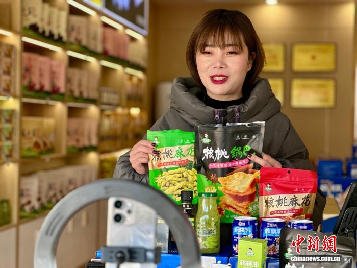 2025年12月,甘肅隴南市武都區(qū),當(dāng)?shù)仉娚虖臉I(yè)人員直播介紹由當(dāng)?shù)赝撂禺a(chǎn)加工成的零食。閆姣 攝
