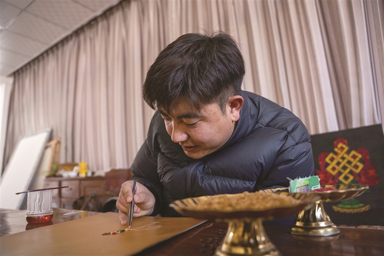 如今,仁青多吉依然在唐卡繪制與青稞文創之間忙碌著。陽光掠過他剛完成的一幅作品,黑頸鶴的棕褐色喙部、漸變棕灰的羽翼在光影下栩栩如生,一粒粒青稞如同被賦予了生命,靜靜訴說著林周的生態與農耕故事。工作室里,畫師們偶爾會停下手中的筆,圍過來看他的創作進度,時不時交流幾句,歡聲笑語間,傳統技藝的火種在默契中傳遞。