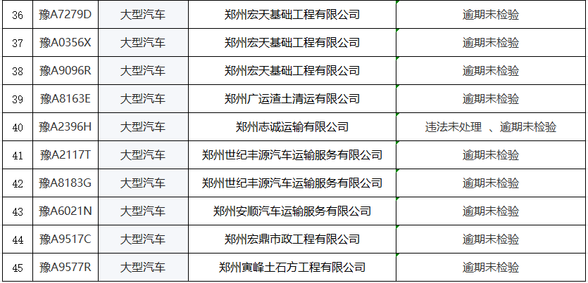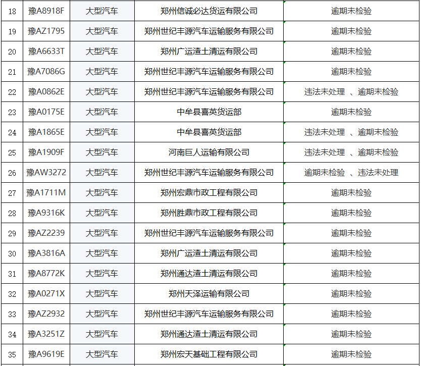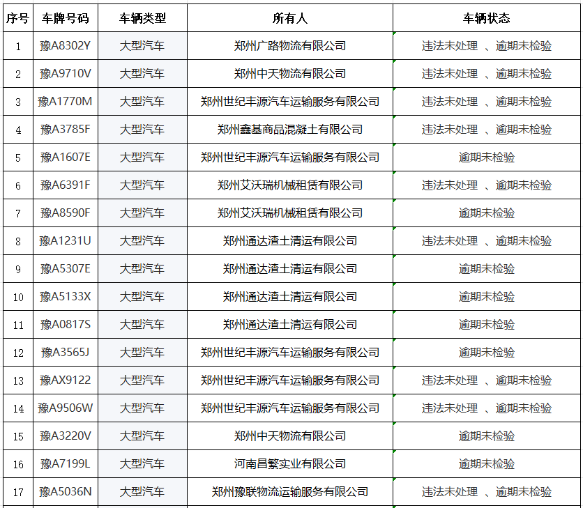 為進一步加強道路交通安全源頭監管,全力開展道路交通安全隱患“清零”工作,從源頭預防重特大交通事故的發生,減少道路交通安全隱患,保障人民群眾的生命財產安全。中牟交警大隊經過巡查,發現19家運輸企業存在道路安全隱患,現對以下企業以及所屬的45臺違法未處理、逾期未檢驗車輛予以曝光,以此警示廣大運輸企業切實履行安全生產主體責任,提醒職業運輸駕駛人主動防范交通事故,確保道路交通安全。