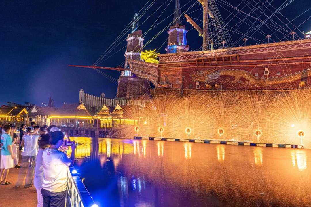 海南長影奇幻樂園打鐵花表演吸引游客駐足。袁琛 攝