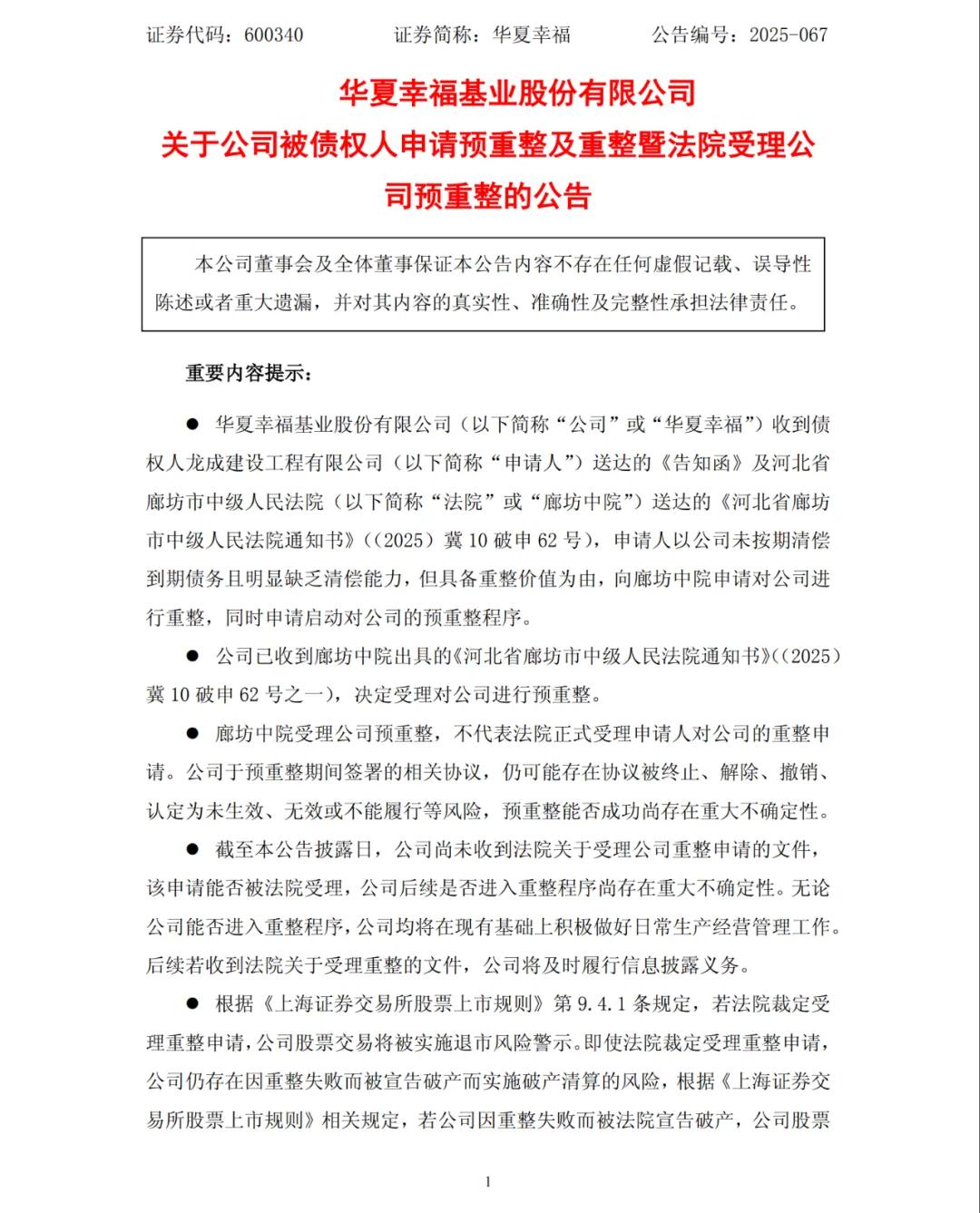 11月17日,華夏幸福公告稱,收到河北省廊坊市中級人民法院送達的《通知書》,債權人龍成建設工程有限公司,向河北省廊坊市中級人民法院申請啟動華夏幸福重整及預重整程序,目前法院已受理。華夏幸福在公告中強調,“對預重整無異議”。
