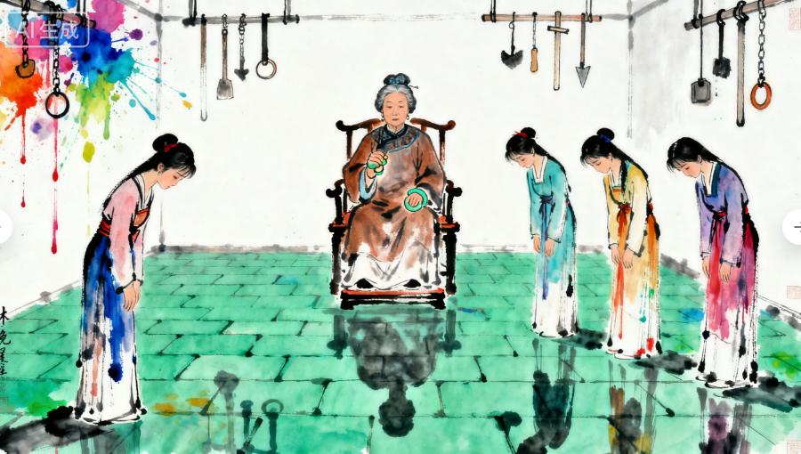 艷香閣的掌事媽媽姓劉,人稱 “劉媽媽”。她年近五十,臉上涂著厚厚的脂粉,眼神卻像毒蛇一樣銳利,讓人不寒而栗。劉媽媽把林晚星和另外四個剛被賣進來的少女帶到后院的 “訓誡房”,這里沒有華麗的裝飾,只有幾張冰冷的木桌和幾個椅子,墻角還放著藤鞭、戒尺等懲戒工具。?