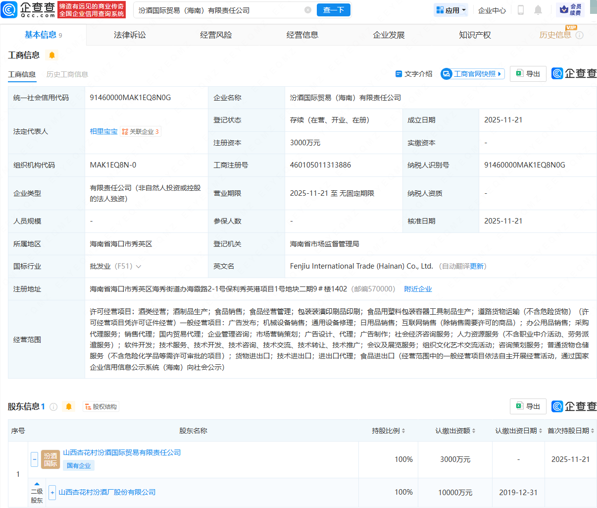 企查查APP顯示,近日,汾酒國際貿易(海南)有限責任公司成立,法定代表人為相里寶寶,注冊資本為3000萬元,經營范圍包含:酒類經營;酒制品生產;食品銷售;食品經營管理;包裝裝潢印刷品印刷等。企查查股權穿透顯示,該公司由山西汾酒(600809)間接全資持股。