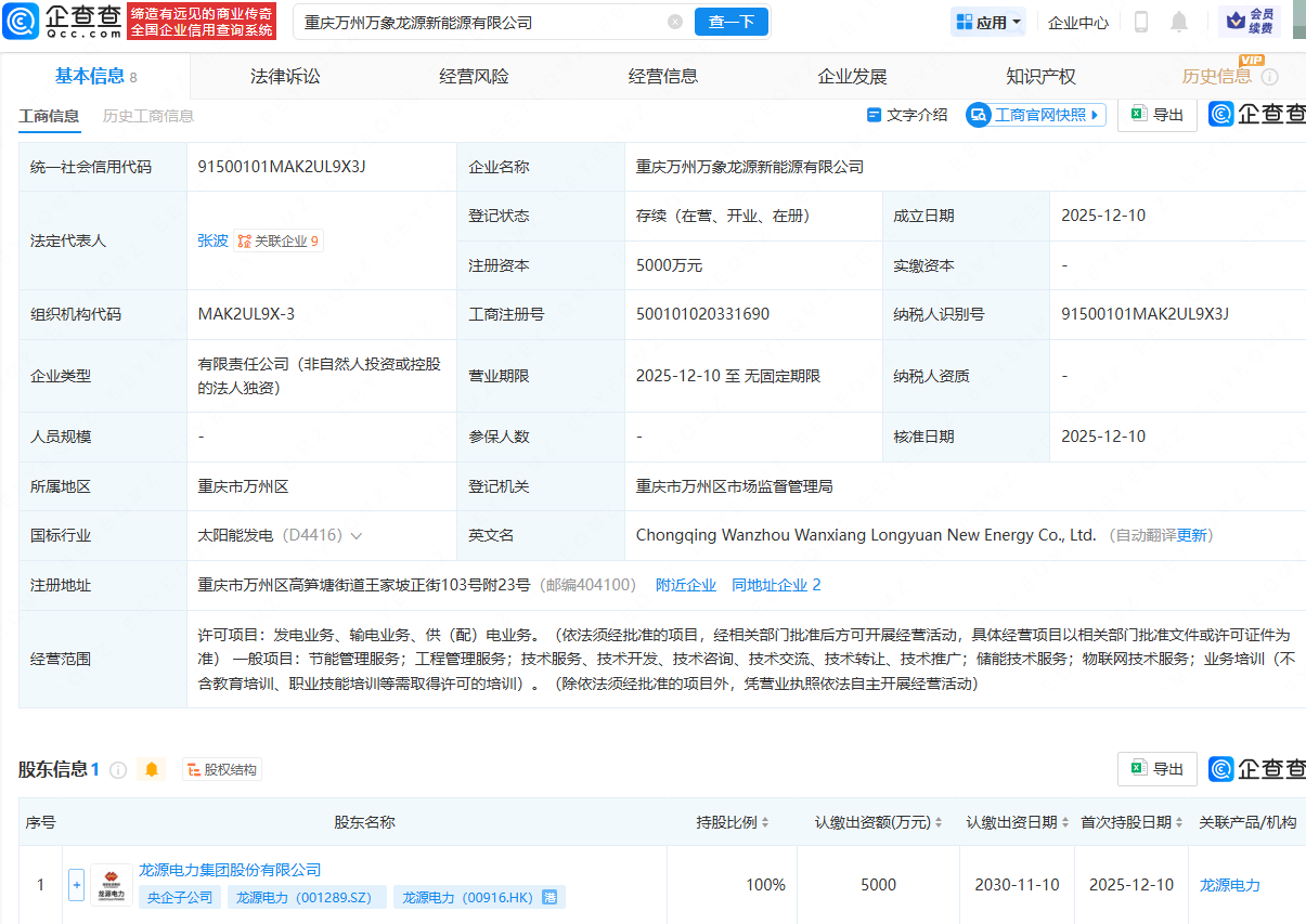 企查查APP顯示,近日,重慶萬州萬象龍源新能源有限公司成立,法定代表人為張波,注冊資本為5000萬元,經營范圍包含:發電業務、輸電業務、供(配)電業務;儲能技術服務;物聯網技術服務等。企查查股權穿透顯示,該公司由龍源電力(001289)全資持股。
