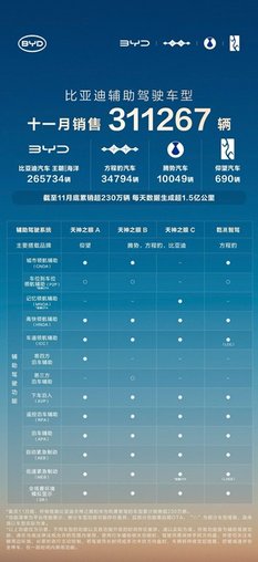 近日,比亞迪公布了其搭載天神之眼輔助駕駛系統(tǒng)的車(chē)型在11月的銷(xiāo)售數(shù)據(jù),全月銷(xiāo)量達(dá)311267輛,繼續(xù)引領(lǐng)市場(chǎng)。其中,比亞迪王朝與海洋系列貢獻(xiàn)265734輛,方程豹、騰勢(shì)、仰望等高端及個(gè)性化品牌亦表現(xiàn)穩(wěn)健,共同構(gòu)筑了比亞迪在智能駕駛領(lǐng)域的強(qiáng)大產(chǎn)品矩陣。