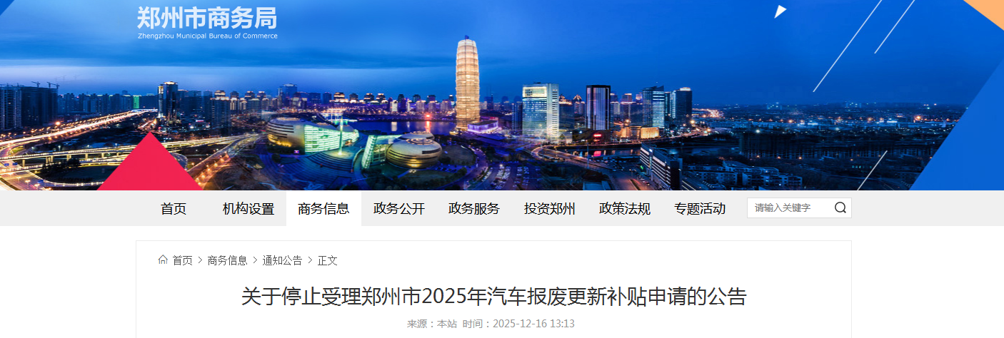 12月16日,鄭州市商務局發布《關于停止受理鄭州市2025年汽車報廢更新補貼申請的公告》,具體公告如下: