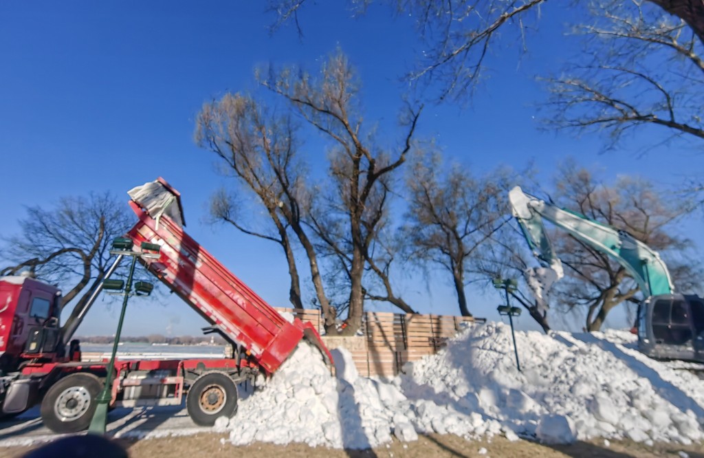 防洪紀念塔旁,十多米高的大雪坯上,工匠們正在精雕細琢,幾匹“駿馬”已經呼之欲出。