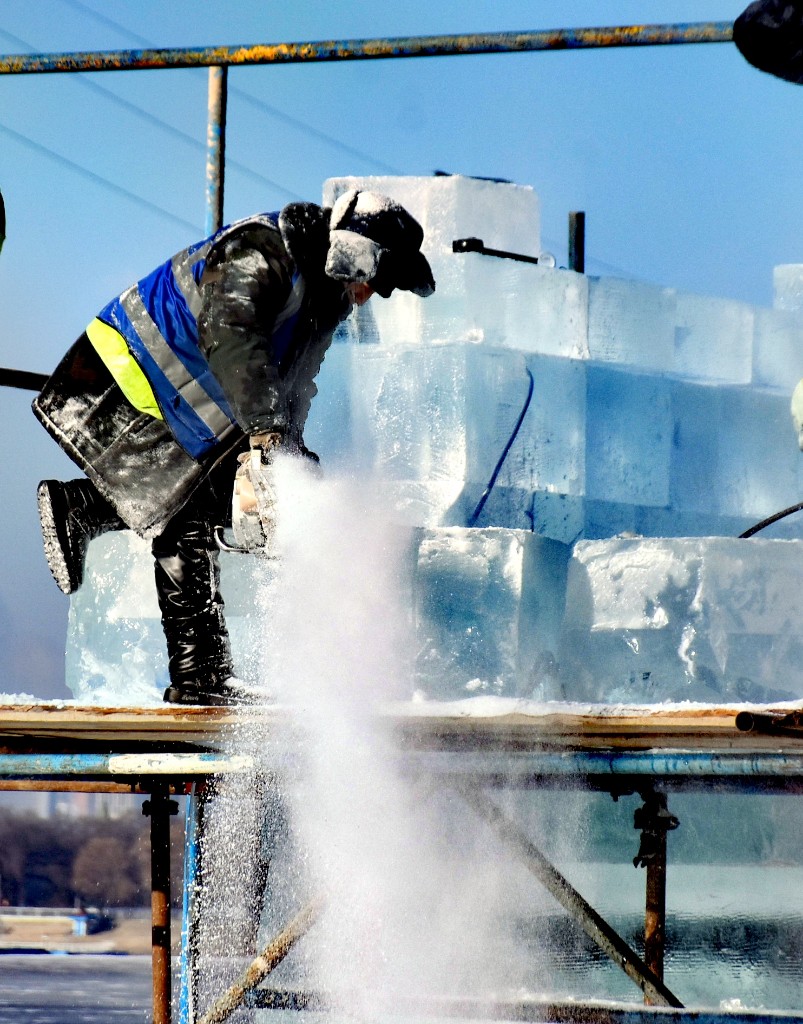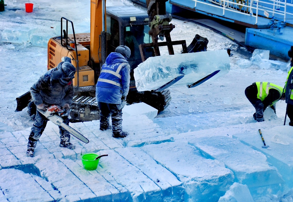 通江街附近江畔,百米冰滑梯正在建設中。現場,有的工人用冰鏟切削冰塊,有的工人在一層層地壘冰塊,到處可見繁忙的施工場景。