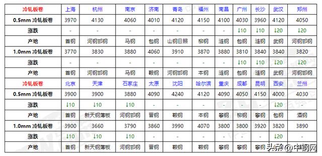 今全國冷軋價格弱穩運行,幅度跌10-20,目前鋼廠產量減少,有些地方受天氣預警影響,個別產線檢修,目前基本面驅動仍然向下,價格上漲動力偏弱,預計明日冷軋板卷價格持穩運行;